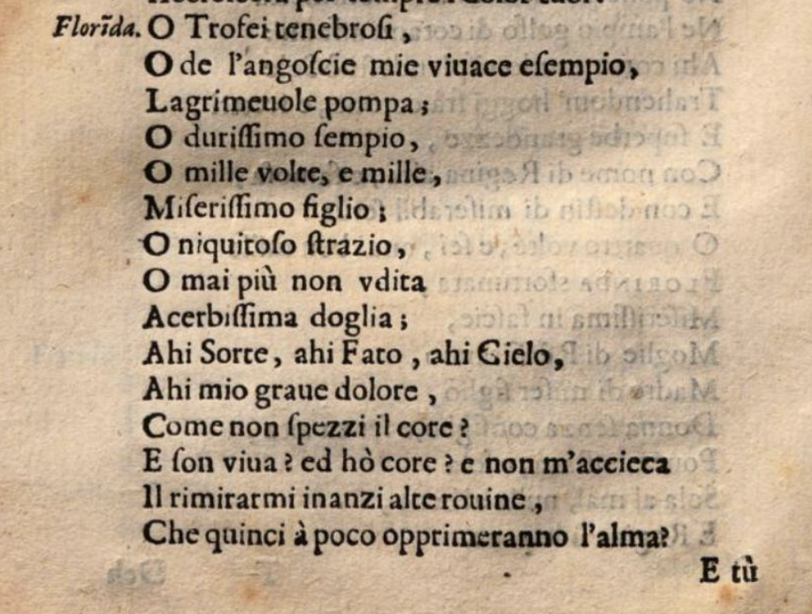 In the preface of his 1608 edition of La Dafne, Marco da Gagliano underlines the exceptional position of Claudio Monteverdi, after composing a work that for the first time succeeded to revive the value of music from the antique past in such a way that it visibly moved the whole theatre to tears.