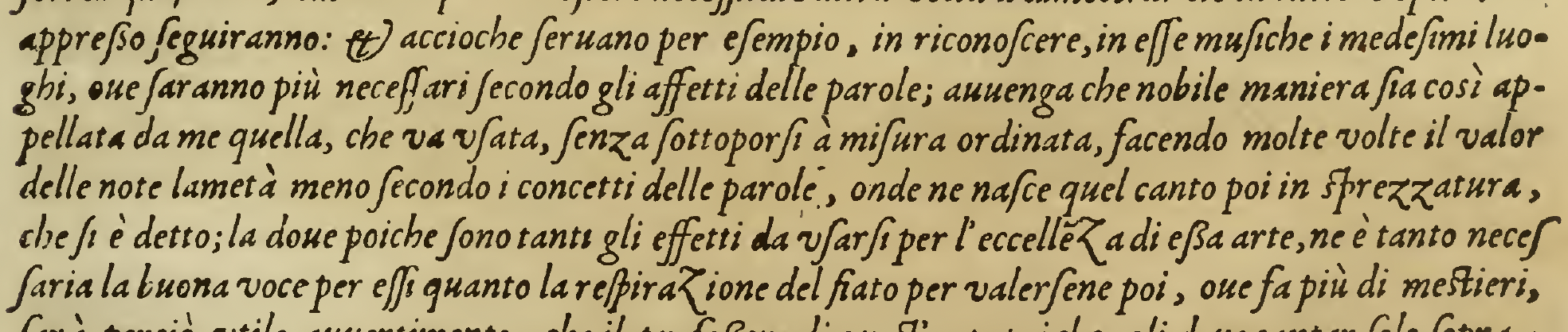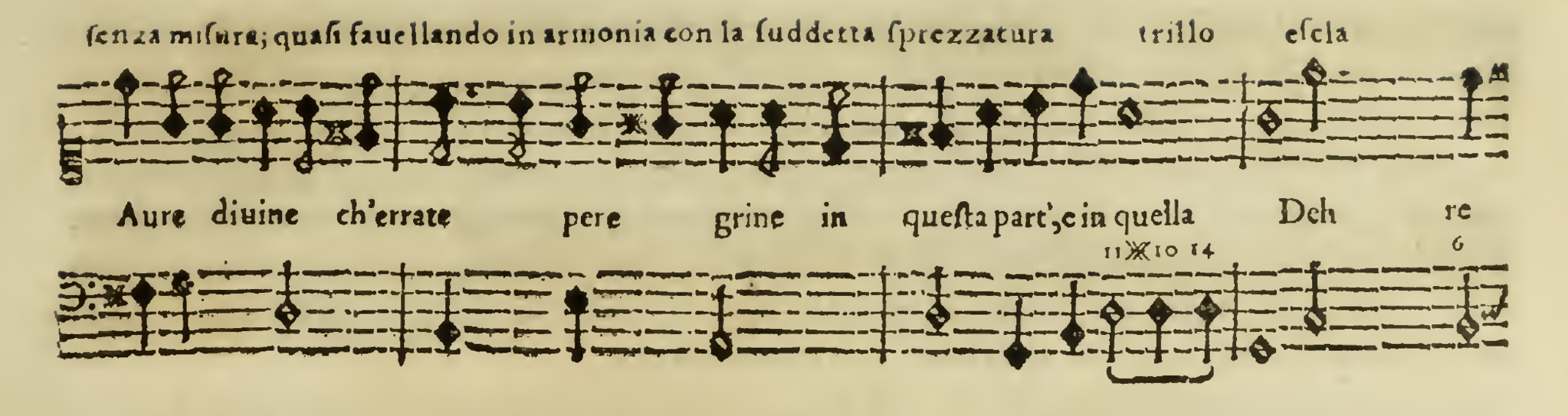The term sprezzatura was first used by Baldassare Castiglione to indicate a noble kind of effortlessness and display of freedom in public performance of a skill. The way Caccini uses it suggests a narrow connection to Monteverdi's intended 'natural way of imitation.' In his Nuove Musiche of 1602, Caccini is rather explicit in his explanation of the function of sprezzatura concerning the rhetorical implications for the text. Half a century after Vicentino (see above), he discusses the same ideals and even gives a very concrete example (see illustration) for a better understanding. As Vicentino already remarked, there are rhetorical aspects of the performance that could not be notated in the music, and one of them was alterations in the misura, which implied both tempo and measure. As Caccini formulates; "one does not submit to the ordinary measure, but many times cuts the value of notes by half, following the meaning of the text,....from where consequently that song is born in sprezzatura..."
