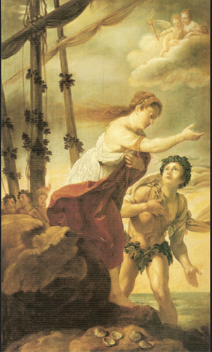 Venus had to rise up from the sea (Vener uscendo dal mare), a description that calls Botticelli to mind. Giove was blessing the connection of Bacchus and Ariadne from heaven, the Palazzo Ducale has a good example of a theatrical depiction on a vault. And finally, the only words sung by Bacchus are in the role of the groom, promising Ariadne to shine among the brightest stars.