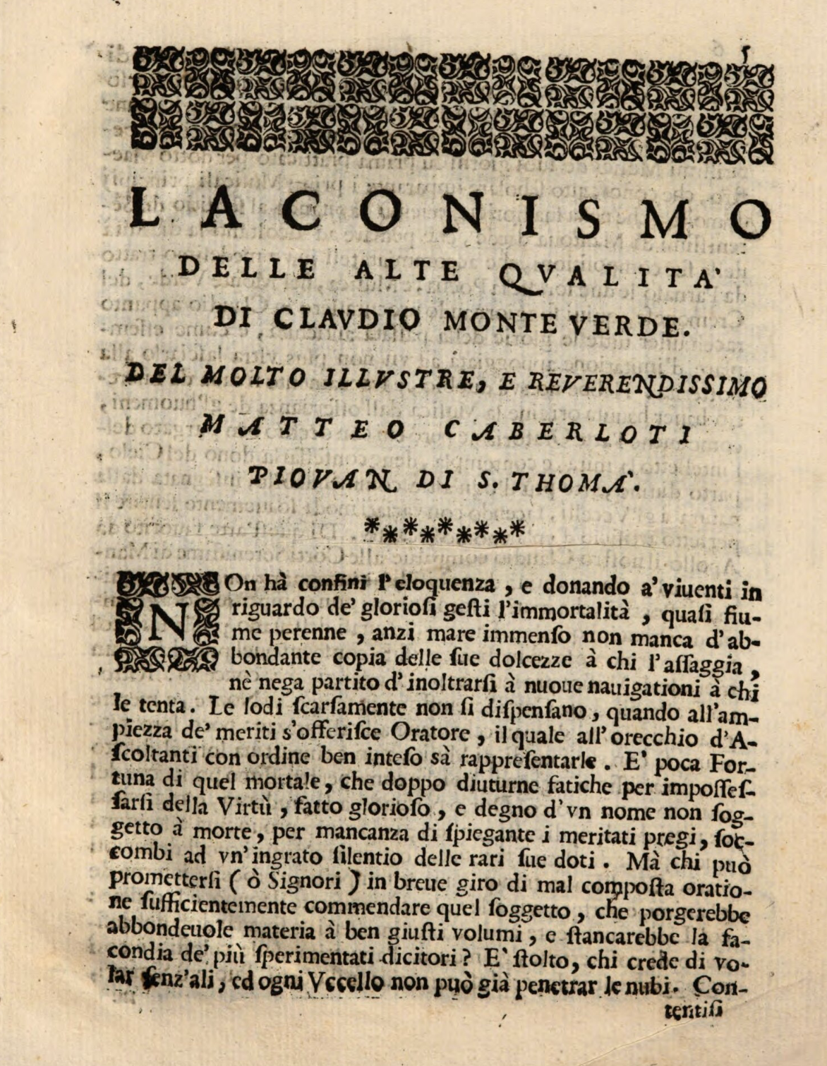 Ma essendole poi aggiunta la forza della musica dal sig. Claudio Monteverde maestro di capella del duca, uomo di quell valore ch’il mondo sa, e che in quell’attione fece pruova di superar se stesso.