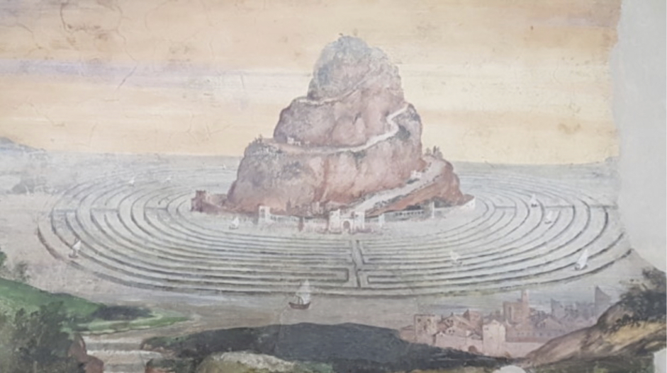 At the top of Mount Olympus stands the altar of Faith. In the Leonbruno fresco, the labyrinth symbolises the transformative journey that must be made to start an individuation process of climbing Mount Olympus, ending at the altar of Faith.