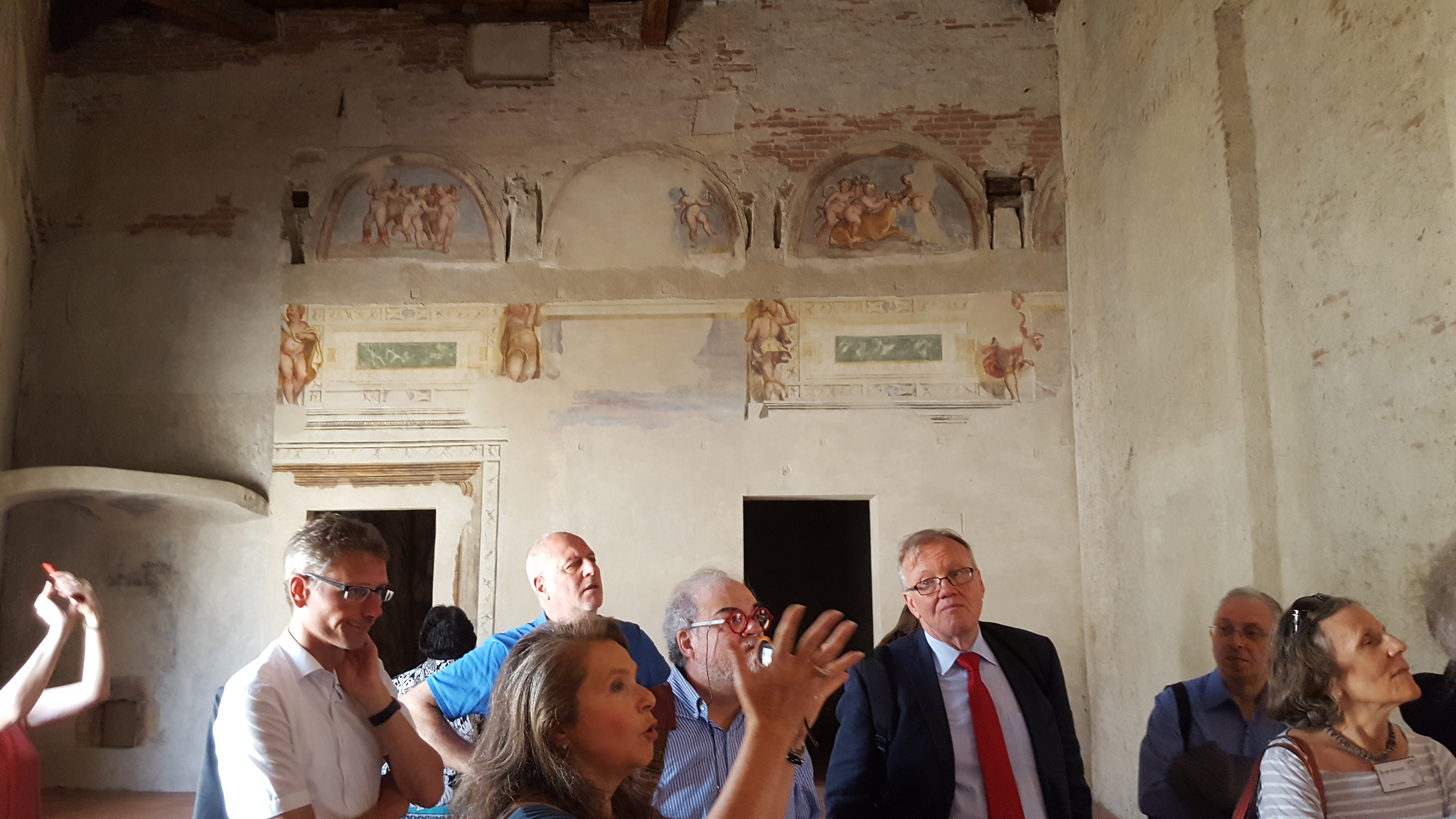 In the original garden of Palazzo Te, there was a maze of boxwood, which now no longer exists. The palace was built on an island and more or less around a labyrinth surrounded by water. The fictitious return of Monteverdi in Mantua could be situated here. There is an intriguing fresco by Lorenzo Leonbruno combining two favorite Gonzaga emblems, the labyrinth and the mount Olympus. This last symbol was connected to Duke Federico II, who commissioned the construction of Palazzo Te. The respected emblem was granted to him and the Gonzaga family in 1530 by emperor Charles V on the occasion of promoting him from marquis to the first duke of Mantua.
