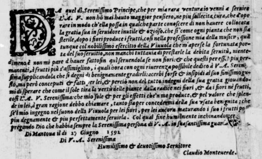 Serenissimo signore mio signore et patrone colendissimo, La favola d’Orfeo che già nell’Accademia de gl’Invaghiti sotto gl’auspitij di Vostra Altezza fù sopra angusta Scena musicalmente rappresentata, dovendo hora comparire nel gran Teatro dell’universo à far mostra di se à tutti gl’huomini, …*)