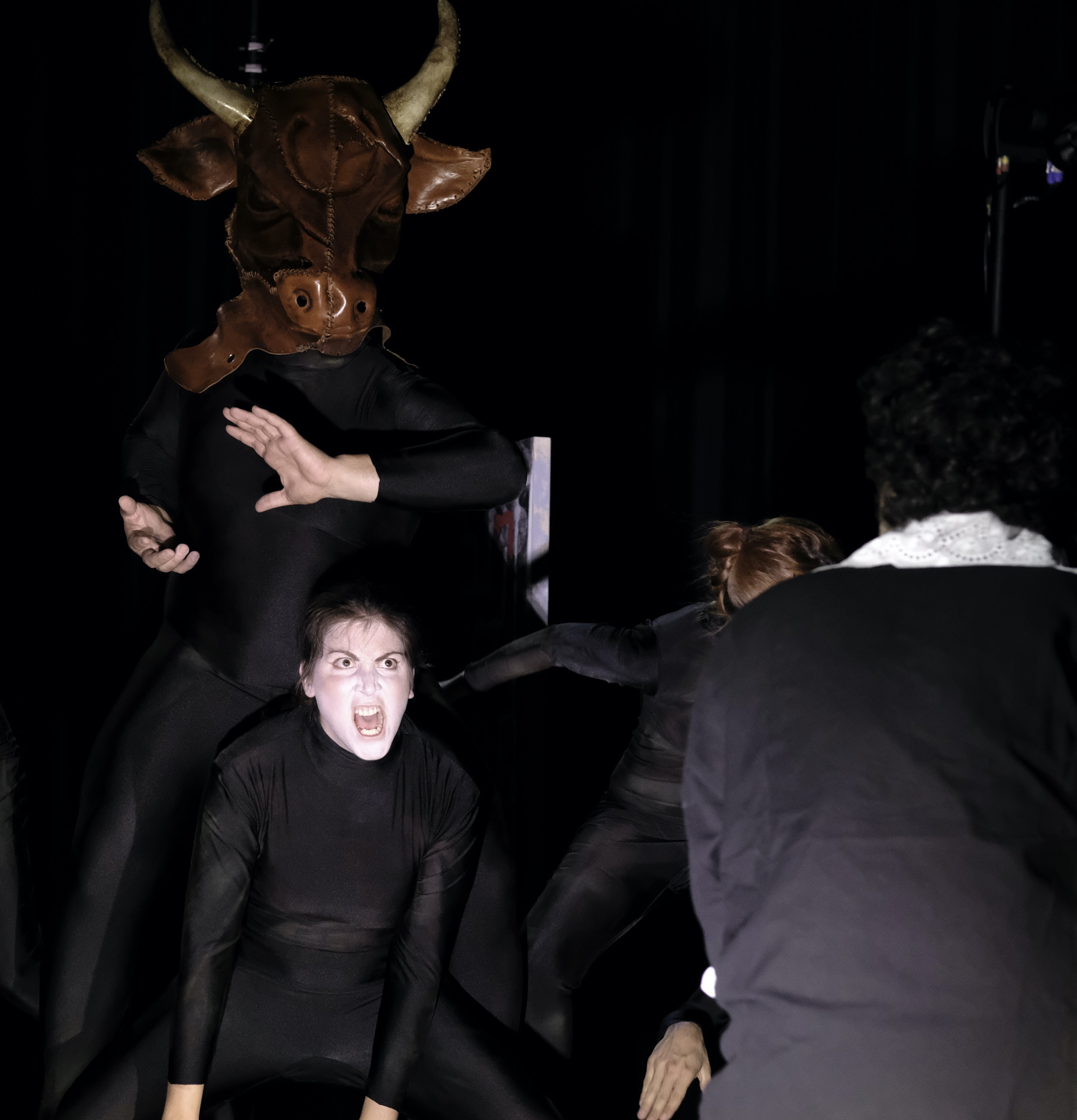In La Tragedia di Claudio M, the initial finale of Orfeo is crossfaded with the original ending of L'Arianna, where Bacchus arrives as the saving god, and the original ending of Orfeo, the death of Orpheus, lynched by the furies (Baccanti).