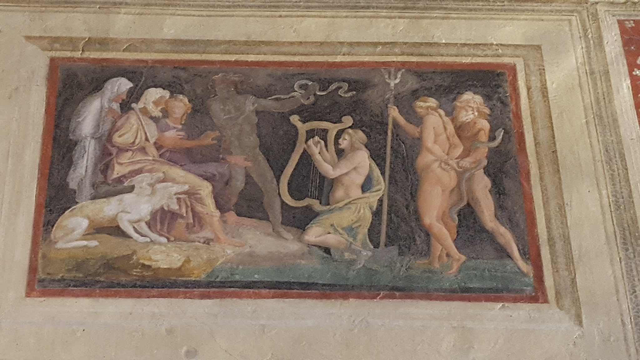 At the Gonzaga court in Mantua the myth of Orpheus was very present in the decorations on the walls of the palazzi by Giulio Romano (frescos in Palazzo Te) and Andrea Mantegna (illusionistic relief carvings about the life of Orpheus).