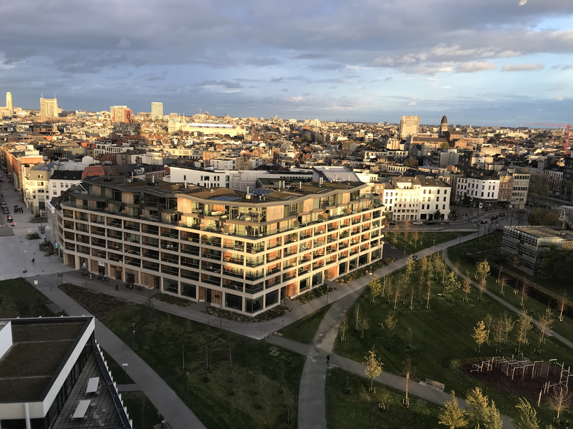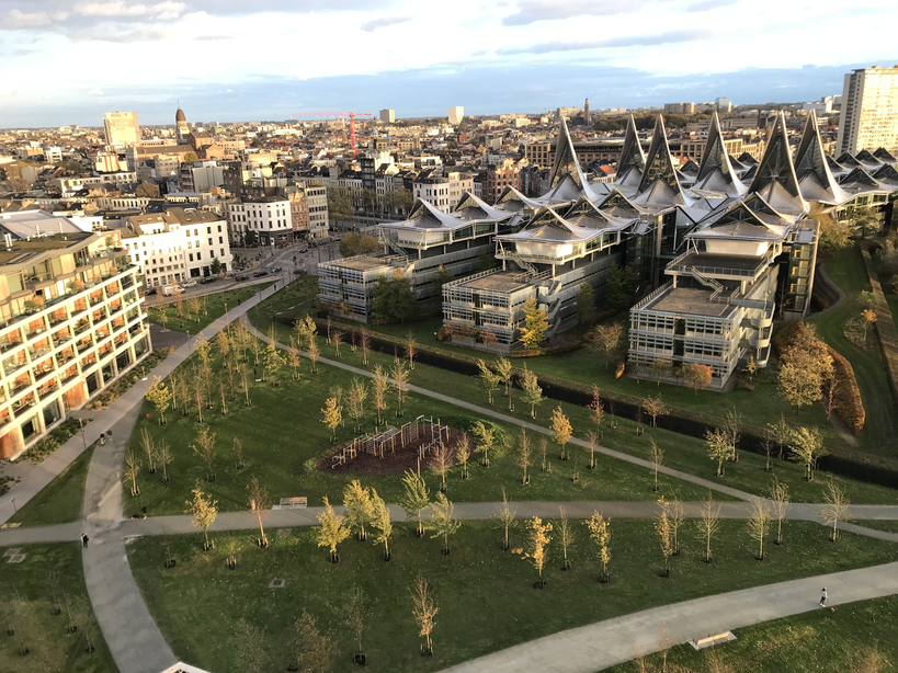 Het zal de invloed van Nele haar aanwezigheid zijn, maar ik voel de urgentie om de gebouwen fysiek op te meten. Hoogbouw, horizontale lijnen, de puntdaken van het justitiepaleis. De structuur van de wijk loopt verder door mijn lichaam en vertaalt zich in bewegingen. Op die manier ervaar ik de bouwlagen, de blokken, de inplanting. En het voelt fijn om met een soort werkelijkheid aan de slag te gaan.