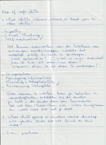 Na de sessie en de observatie komen Nele en ik elkaar terug tegemoet om onze waarnemingen met elkaar te delen. Nele geeft heel heldere inzichten weer. Ze ziet weinig verbindingen. De architectuur is volgens haar waarneming bijna uitsluitend individualistisch. Wanneer ik vraag wat ze hiermee bedoelt, zegt ze dat ze heel veel individuele gebouwen ziet die zijn ingepast op de beschikbare oppervlakte van de wijk. Maar er zijn geen fysieke, noch psychologische verbindingen te bespeuren tussen de verschillende constructies en hun functies. Ik vraag haar of je dit als mens onbewust ook fysiek en psychologisch zou kunnen ervaren? Daar is ze zeer zeker van. Ze merkt op dat de wijk een gestapelde wijk is. Mensen wonen naast en boven elkaar. In mijn verbeelding zie ik een blokkendoos met blokken die elk uit een andere set afkomstig zijn.