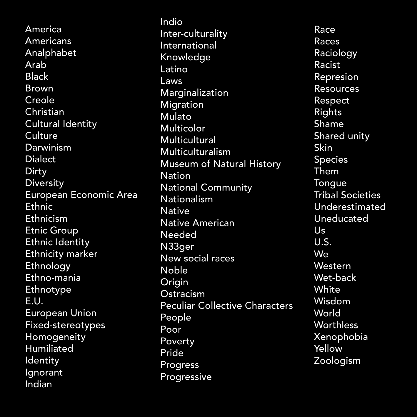 The intention of this glossary is to put in evidence and in “equal” conditions a series of terms that nourish the differences between people on a daily basis. Some are “forbidden” words due to their clear xenophobic connotation, however there are others that go unnoticed in our daily lives and there are even many that represent or have represented those intentions of “inclusion” that racists nations make towards the inhabitants of less “fortunate” places.