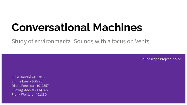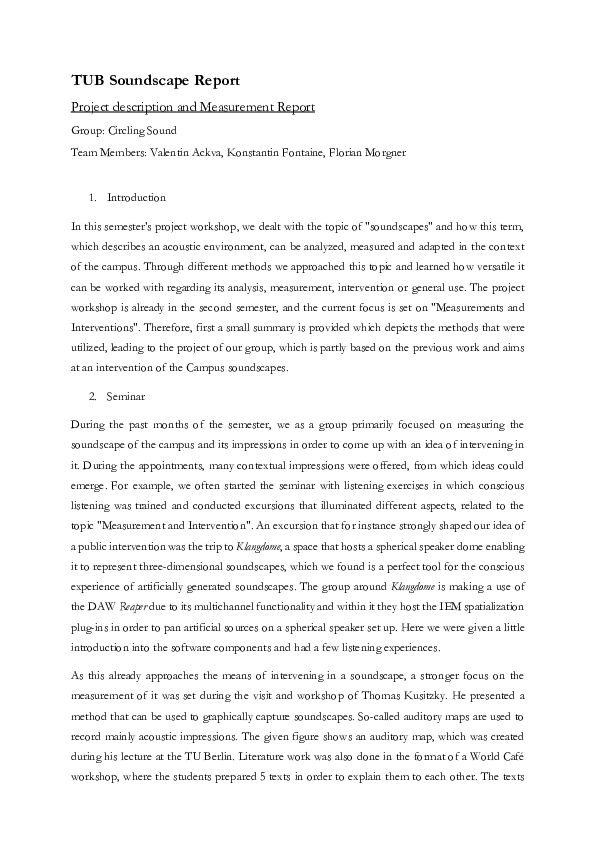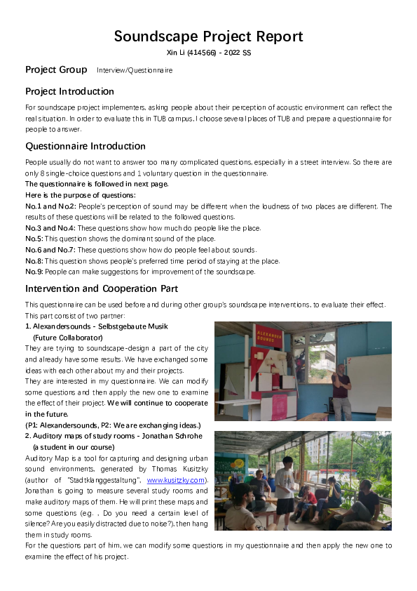 The main goal of the second semester were soundscape measurements of the TUB campus, as well as the planning and implementation of practical soundscape interventions based on them. We also set as goals the creation of questionnaires for campus users and the continuation of the web presence. It was important to make the knowledge transfer between the two semesters successful. The didactic goals and applied methods corresponded to those of the first semester, with the difference that in the summer semester the small group work involved more effort, as well as the creation of an interim report as an examination requirement. In addition, a questionnaire was established as a data collection method in the second semester.