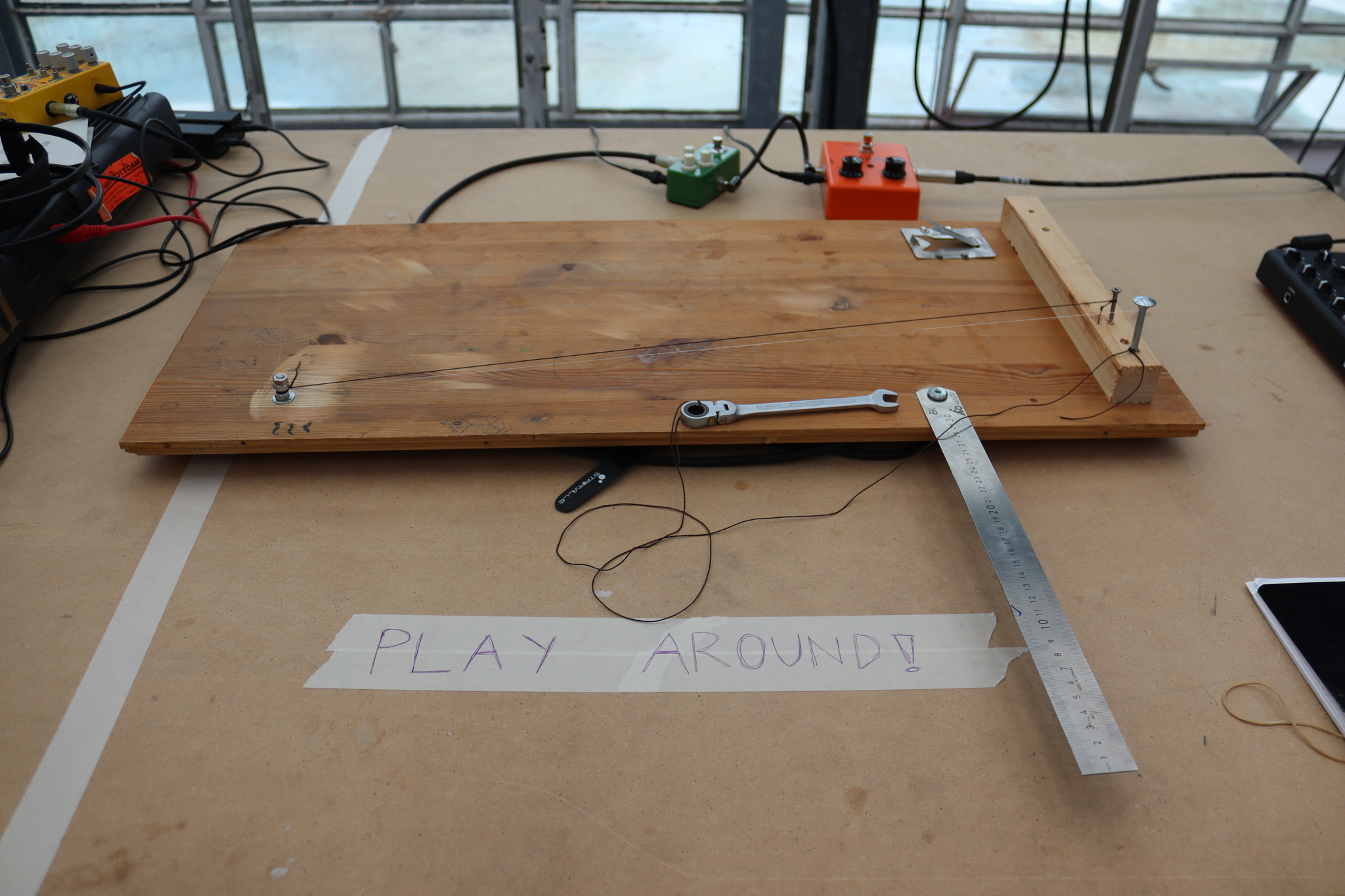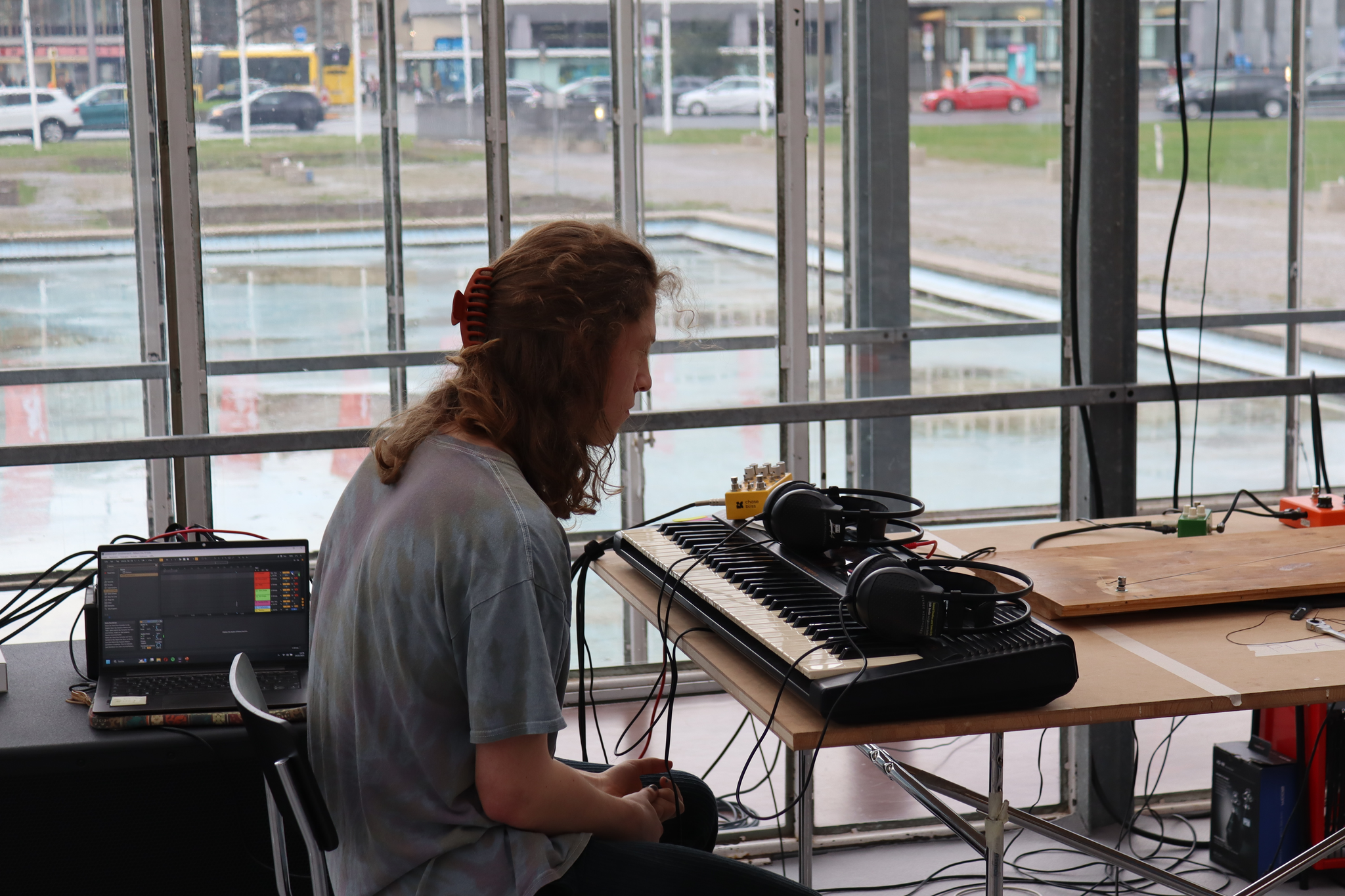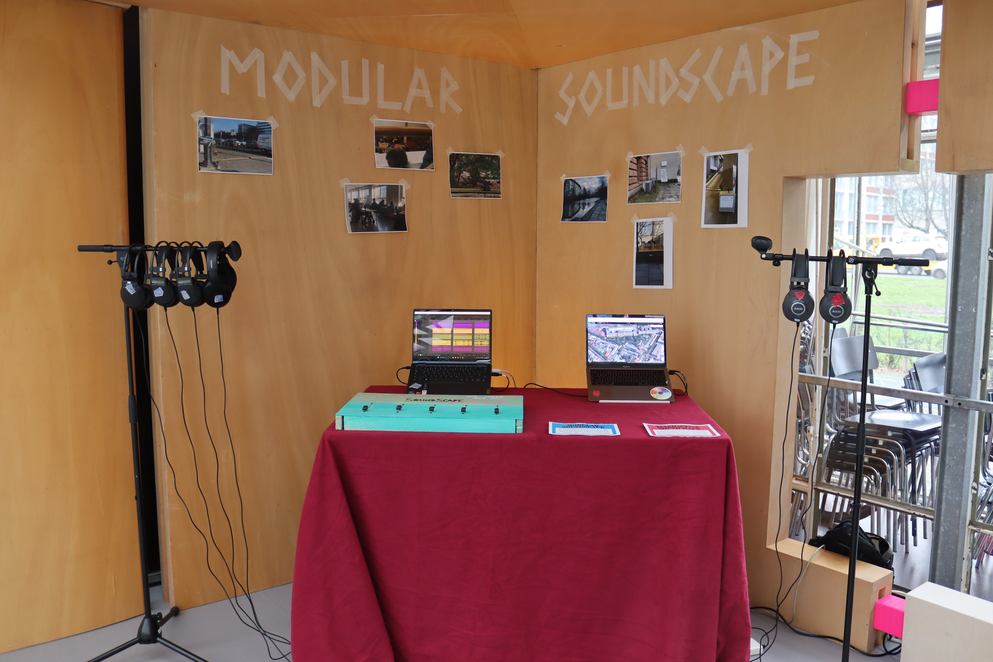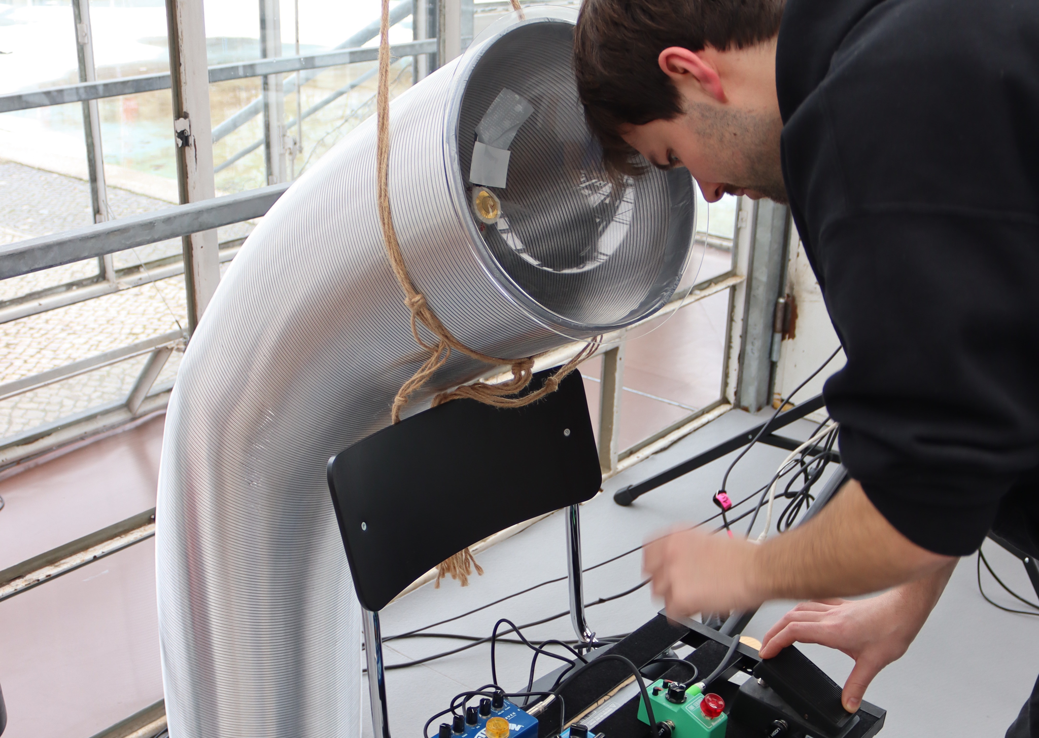 The project aims to create an interactive experience by using microphones to record urban soundscapes from the outside and bring them into the room. Once inside the building, different effects and microphones are placed in random places and invite to create new soundscapes. The auditory is encouraged to interact with the effects and generating interactively unique compositions.