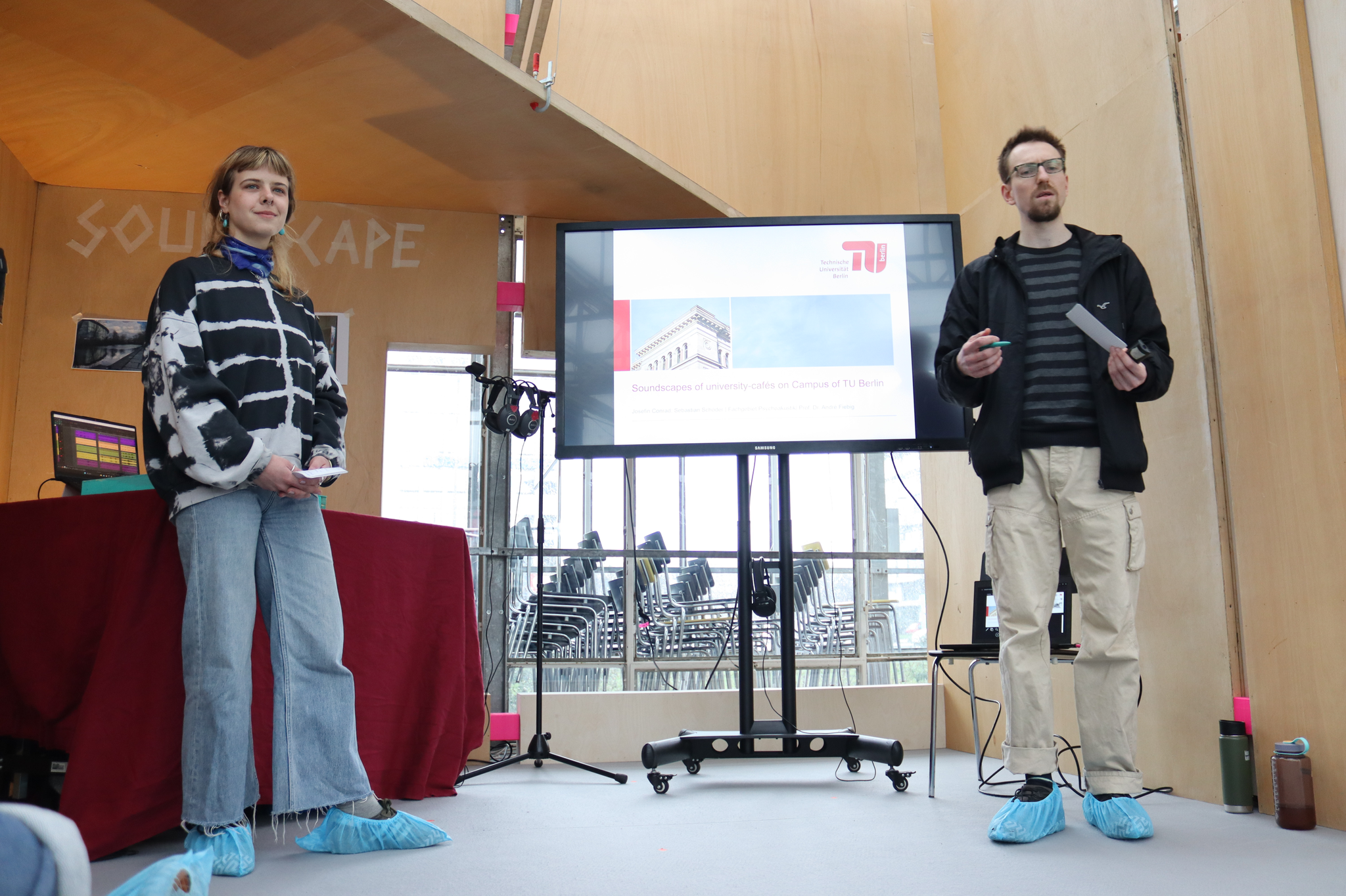 The third semester of the project had the topic of awareness. The outputs were presented at the BHROX bauhaus reuse. Surrounded by the sound of the cars in the roundabout, we brought this exhibition to the center of the Ernst-Reuter-Platz. The BHROX is a participatory urban laboratory for research, education and performative practices, situated close to and in cooperation with the university. The Soundscape Project TUB spent the last months reflecting upon noticing the sounds of the campus and urban spaces; perceiving the social and psychological effects of the sonic; and accessing other sonic imaginaries.
