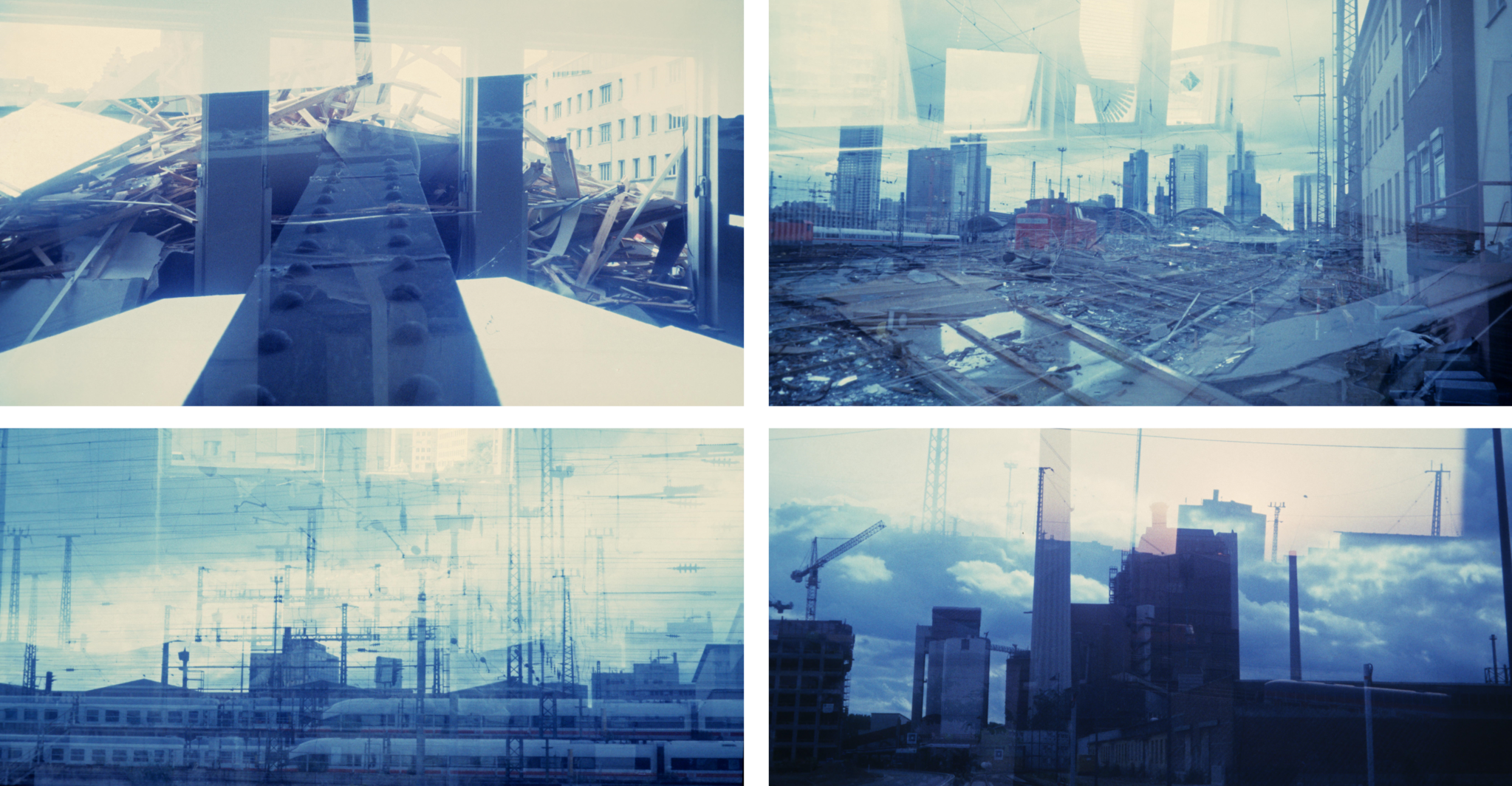 - n-fach-Belichtungen verweisen auf die Unkontrollierbarkeit des In- und Outputs, auf die gebrochenen, zerschnittenen Gefüge, welche sich durch zufällige Möglichkeiten der raum-zeitlichen und imaginären Überlagerungerungen immer wieder neu ergeben.