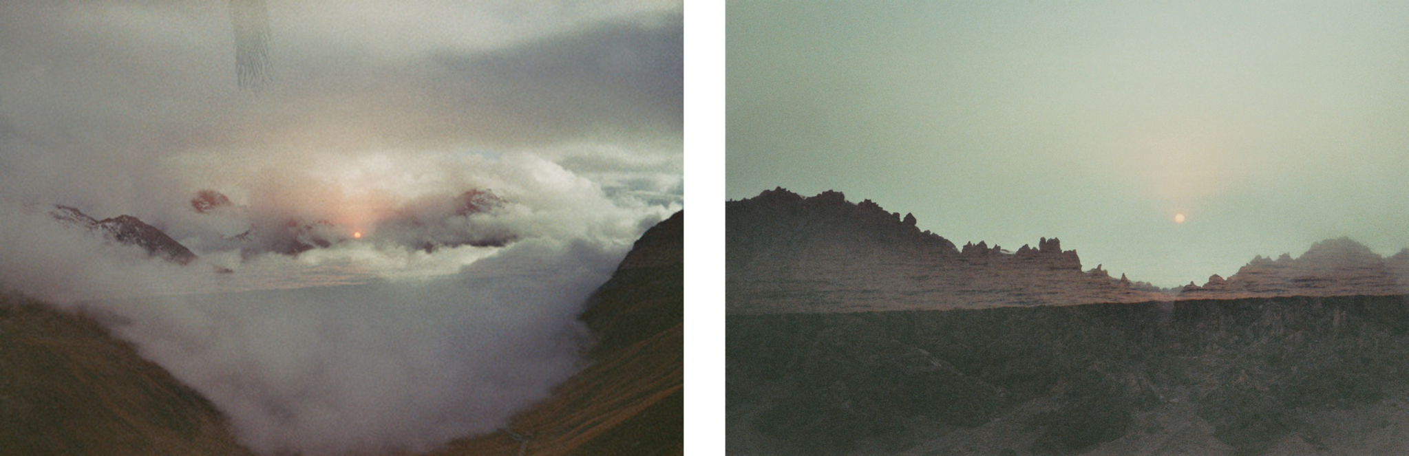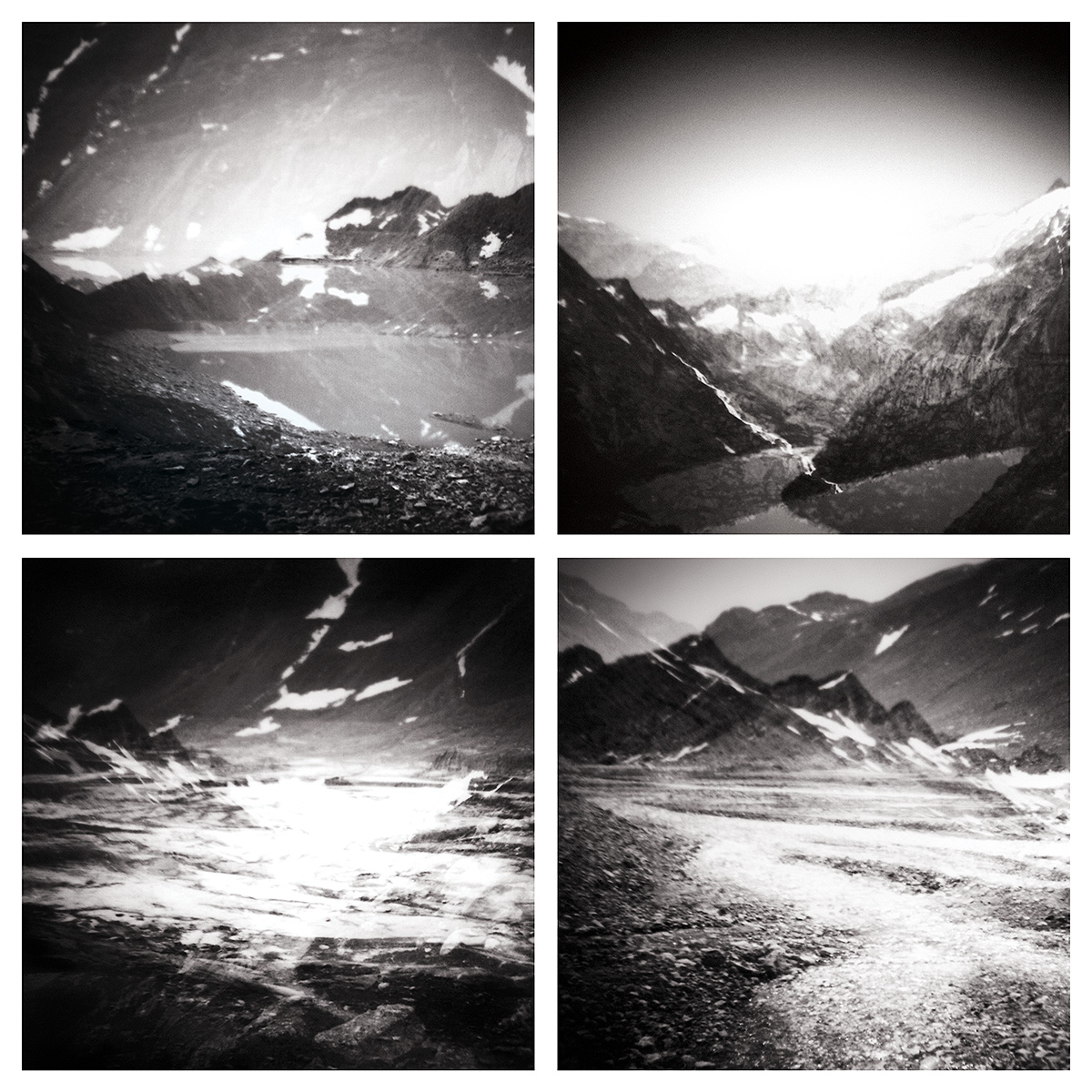 Der Materialismus der Begegnung wird in den folgenden zwei Serien von n-fach-Belichtungen deutlich. Hier liegt je eine maximal räumliche und zeitliche Distanz zwischen den einzelnen Belichtungen. In der ersten Serie „Aleatory Materialism 1“ wurde ein Film auf einer Straße im Hamburg gefunden. Mir war nicht kenntlich, wer die erste Reihe photographiert hat und wann der Film erstmalig belichtet wurde [i]. Bei der zweiten Serie „Aleatory Materialism 2“ treffen Pazifik und Kaukasus oder vielleicht auch Pyrenäen aufeinander. Auch hier kann ich nicht genau rekonstruieren, wann und wo die Aufnahmen gemacht wurden, da der Film jahrelang in einer Schublade lag und einige Orte in der Zwischenzeit mehrfach besucht wurden: