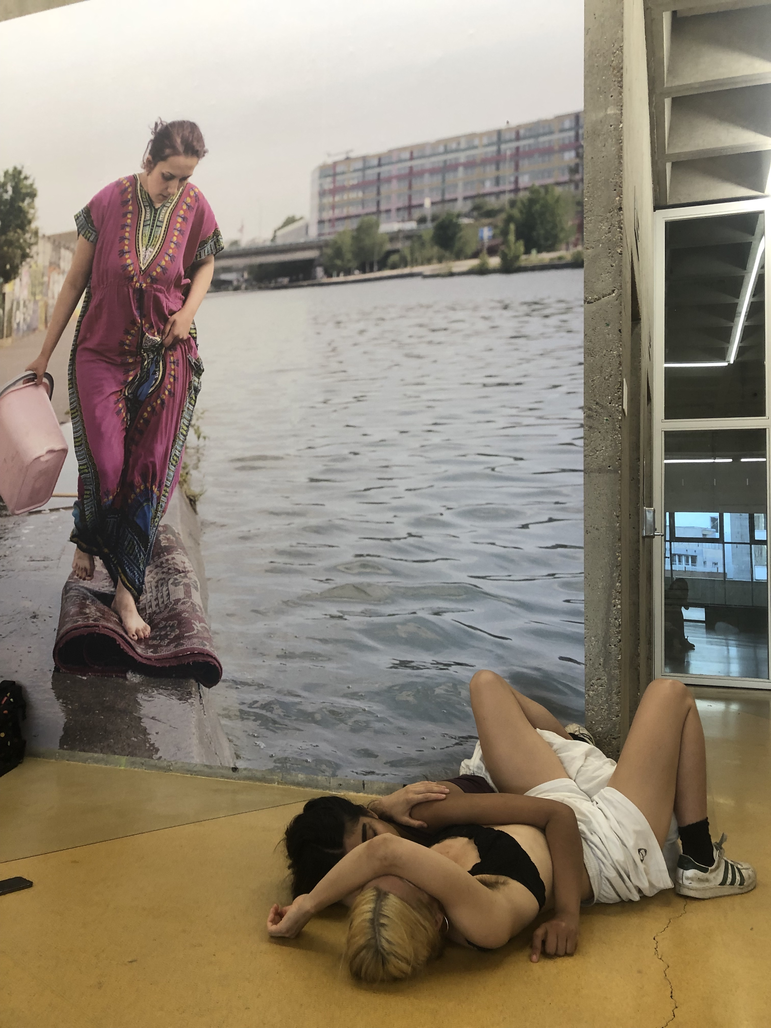 Esta tarde começa com um exercício proposto pelos artistas sonoros Colin e Farahnaz. Propõem que façamos duplas e por 20min, um de cada vez, exploremos o edifício do CN D de olhos fechados. Depois trocamos de posições. Isso está a acontecer exatamente no mesmo dia em que ainda esta manhã, por pura coincidência, estava a caminhar de olhos fechados pelo canal de Pantin. Aqui a ideia é ser mais autónomo, o parceiro só está lá em caso de necessidade e para evitar acidentes graves. O objectivo é prestar mais atenção ao som. Eu agacho-me debaixo de mesas e sinto-me segura, rebolo no chão sabendo que não há como me aleijar, o meu parceiro nunca deixaria que isso acontecesse, noto as diferenças de som quando me aproximo dos escritórios da administração do CND - na conversa pós-exercício alguém comenta sobre a política do som, que quanto mais próximo dos espaços de administração e direção do CND menos barulho há, mais calmo fica - e como no geral o som ganha densidade com os olhos fechados, mas acima de tudo eu bato e tropeço a subir as escadas, mas deslizo por rampas e começo a descobrir que a razão por trás do meu fascínio por elas está ligada à minha pesquisa sobre fluidez e continuidade líquida. As rampas permitem um movimento contínuo enquanto que as escadas uma interrupção, o movimento em rampas pode ser feito com segurança e rapidez mesmo com os olhos fechados, permitindo uma entrega sem esforço à gravidade.