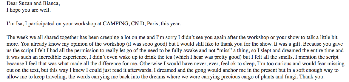 Isto é, claro, muito mais do que aquilo que realmente disse quando me apresentei no workshop, mas algumas coisas são importantes de incluir aqui para tornar um pouco mais detectável algumas conexões entre a minha pesquisa artística e a experiência no CAMPING.