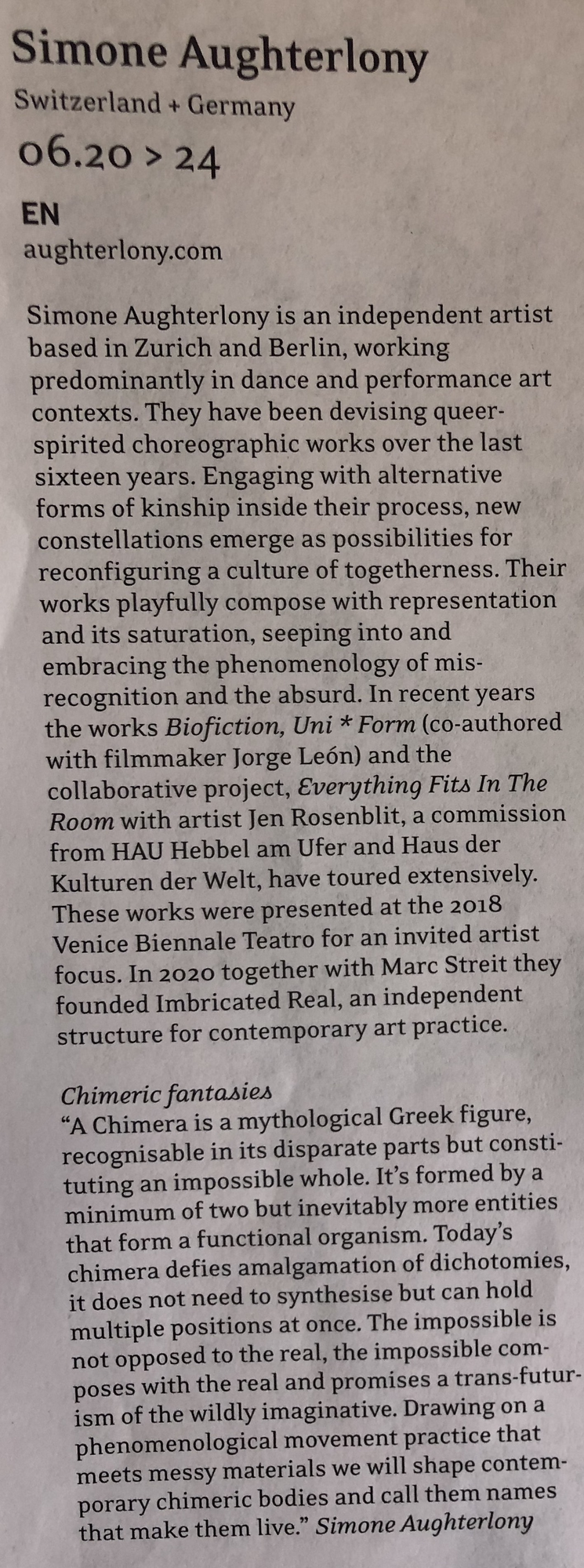 Tenho a opção de escolher 2 workshops da lista de - que me parece 10 mil "quero fazer tudo" - opções, cada workshop consiste num conjunto de cinco sessões de segunda a sexta-feira. Escolho Dimitri Chamblas (alerta de spoiler: o covid-19 vem sem ser convidado e há alterações que têm de ser feitas) e Simone Aughterlony.