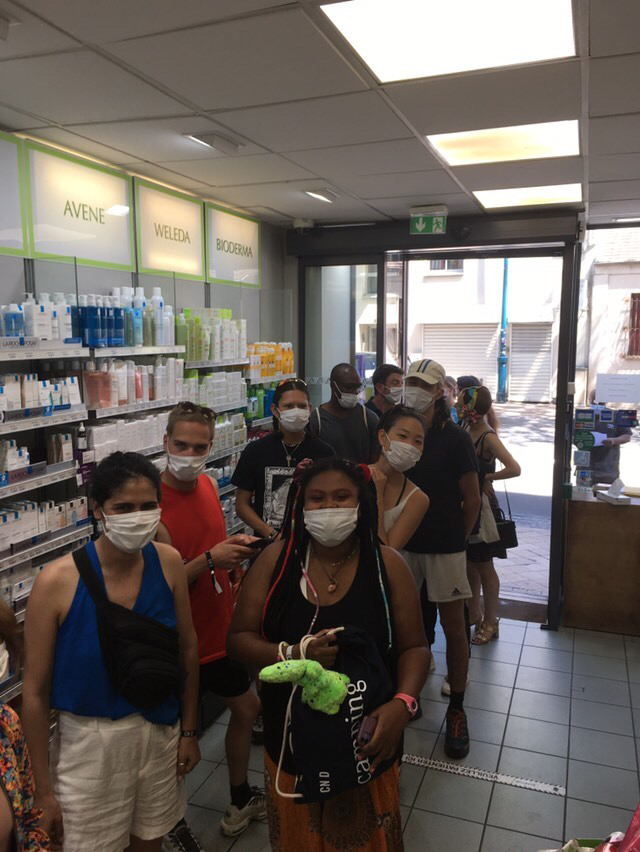 Ouve-se um “ding” cada vez que alguém entra na pequena farmácia e por alguns minutos um ding, ding, ding, ding contínuo compõe a paisagem sonora de mais de 20 pessoas a formarem fila do balcão até à rua. Alguns de nós riem-se nervosamente da situação, fazem piadas, compartilham estórias de Covid, outros fazem scroll enfadonhamente nos seus telefones e esquecem-se de colocar as máscaras no sítio quando estas deslizam insistentemente para baixo, outros estão genuinamente preocupados e murmuram “Eu não posso testar positivo, tenho um espectáculo neste fim de semana” ou “Eu tenho que voar de volta para casa em 3 dias, não posso ficar empancada aqui, não de novo”. Felizmente eu estou bastante confiante de que vou testar negativo, pois recuperei da minha primeira experiência com covid-19 apenas duas semanas antes de vir, e o que realmente me está a chamar à atenção neste momento é que excelente performance tudo isto é, desde o momento à porta do estúdio 4 até este ponto, quando o dono da farmácia se oferece para nos testar a todos gratuitamente.