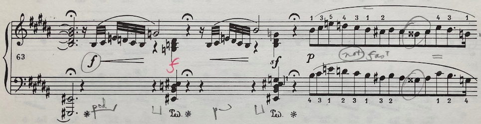 A pianist might choose to embody this catch in several ways. One option is to focus on the relaxation of tension in a reaction against the sudden G7° chord that has preceded the rest. Another embodiment might be more of a visual bounce with the hands, emphasizing the accentuation of the rest. So the rests could be interpreted as drawing the line through, pulling Chopin’s gradual melodic ascension upwards. Or rather focusing on the interruptions, on the thwarting of expectations, which also characterizes the melodic ascent. Other interpretations are just as possible, for example, one in which the pedal is held down to reinforce the dissonance of the minor 7th interval (G to E#). In this case, gestures would still be possible but might be embodied in a more drawn-out or languorous manner.