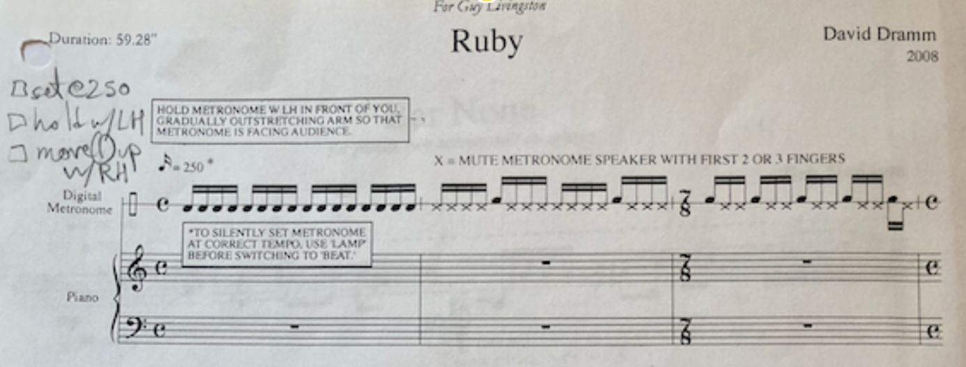 At first, the metronome hardly seems a marker for silence, but gradually, its audible presence emphasizes the silences in the piano score. And its visible presence, too. Embodiment is of supreme importance in this performance (and is notated). Dramm specifies how and where the pianist’s arm should be held (raised, in front, “gradually outstretching arm so that metronome is facing audience”) and that the metronome (called a Ruby) should descend gradually during the diminuendo at the end. In the performance, I add gestural swoops with my left hand to emphasize the rhythmic syncopations, thus generating additional markers that suggest the connectivity of the silences.