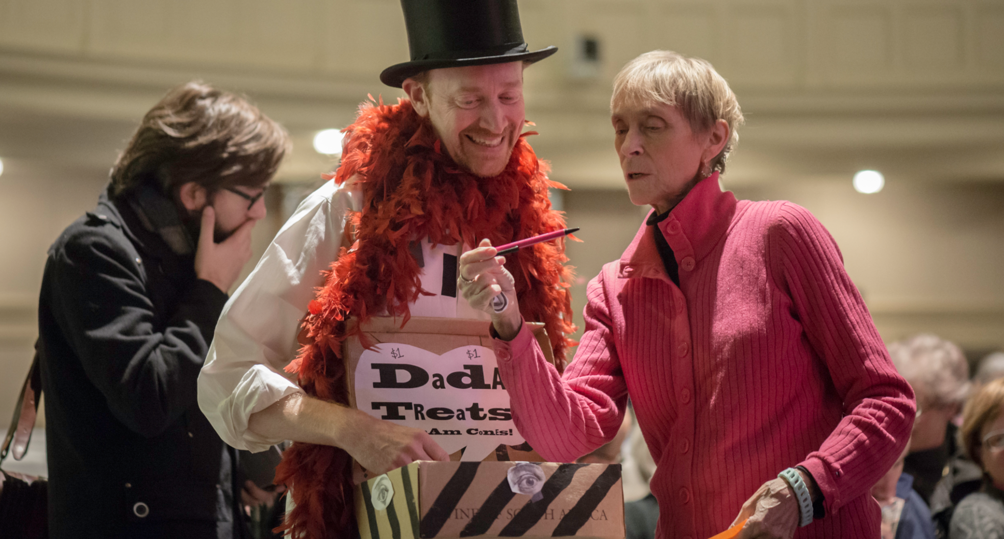Figure: As a response to a silent German audience and as a way of un-silencing myself pre-performance, I began interacting with audience members before each show, selling useless Dada treats and souvenirs. This was also a way to un-silence the audience, giving them also more voice, and more agency in the performance. (Montreal: Salle Bourgie, October 31, 2018)