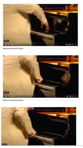 Gestural silence can also be described as embodied silence. The gestures or embodiments are not the silence but are cues or markers for it. Indeed some embodiments may be wildly distracting or even noisy. For example, the three images on the left show pianist Evgeny Kissin performing a rest at the start of Beethoven’s opus 111. He embodies the silence in a very physical, powerful gesture. My argument that the visual plays a crucial role in the experience of performed silence will be supported by analyses of embodied silence.