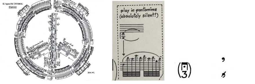 Figure 8: Notational innovations of George Crumb (from left to right): Agnus Dei for solo piano; the ending of Vox Balaenae, in which the pianist plays silently on/over the keys; a precise 3-second pause from Makrokosmos; commas as breaths, and slashed commas which are shorter, more like gasps (Edition Peters: 1972).