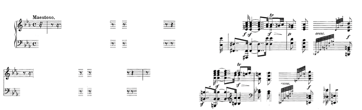 A similar structural importance for silence can be inferred by a visual analysis, in this case, of Beethoven’s last piano sonata. The opening bars are here represented without the notes, and then without the rests.