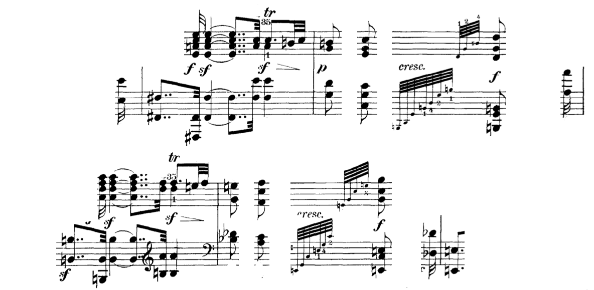 Boom, boom—voom, voom—throom, throom—he struck the grimly vehement opening accents of the first movement, and in a high falsetto he sang along with passages of melodic sweetness, which, like delicate glimpses of light, now and then illuminate the storm-tossed skies of the piece. (Mann, 1947, p. 58)