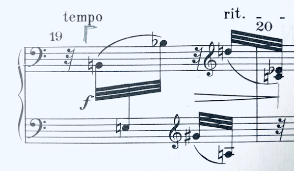 In this second example, from Anton Webern’s Variationen für Klavier, the first rest has no rhythmic equivalent on the lower stave. But on the third beat, the composer introduces a rest on the upper stave while a G# is played in the lower stave (left hand).