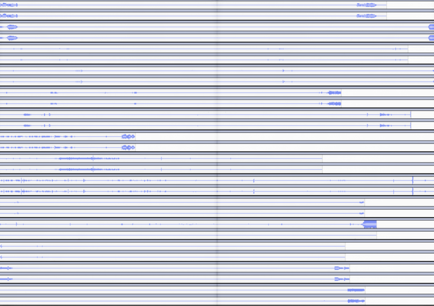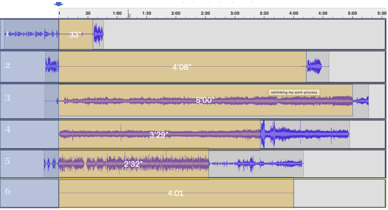 After examining eighty videos of Cage’s composition, I observed that only a few were four minutes and thirty-three seconds long; durations did not seem important. As far as the framing was concerned, some musicians opted to silence the video in post-production—very clearly visible as flat horizontal lines (waveforms 2 and 6 above). Most included all the background noise or created their own noise with shuffling, caressing of instruments, feedback, natural sounds, or fidgeting. In a few cases, the “silence” was louder than the audio before and after the performance (waveform 5, for example). This is not unique to the internet; it could also happen in live performance.