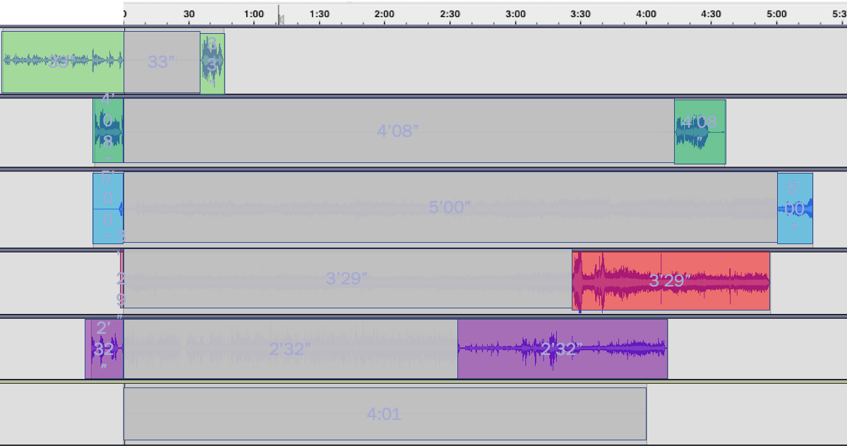 Figure 3: The pre- and post-performance segments resemble book-ends (Livingston & Hernik, 2020). Mostly they are louder (larger waveforms) than the “music” of 4’33”. Occasionally they are quieter (example 3) or non-existent (the bottom example contains no bookends).