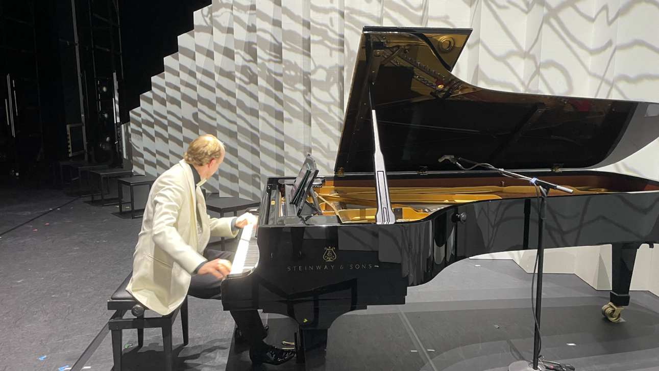 Figure 2: Rehearsing Ballet mécanique in Zürich: my hands curl rapidly off the piano keys (inspired by Richter) to emphasize the precision start of a silence. The oversized jacket also catches the light, amplifying my gestures to the scale of the theater (author’s photo, 2024).
