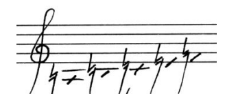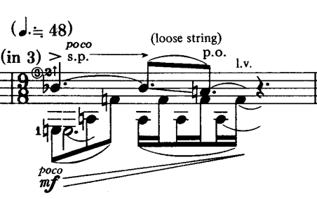 Takemitsu's resurgence of interest in Japanese traditional music meant that traditional Japanese instruments became a great source of inspiration for the composer. One instrument, in particular, fascinated Takemitsu: the biwa. A short-necked, lute-like instrument, the biwa (Japanese: 琵琶) is a wooden plucked string instrument originating from around the 7th Century. The instrument is traditionally performed as an accompaniment to Japanese sung narratives and is played with wooden implements known as bachi (Japanese: 桴, 枹)6. Takemitsu wrote a number of scores that include the biwa such as: November Steps (1961), Eclipse (1966) and Autumn (1973). The guitar and biwa are ancestors of one another as they both used to share an evolutionary history before the diverging7. In fact, the two instruments still share similar characteristics; both are plucked stringed instruments with frets. Takemitsu explores this relationship imitating the sound and technique of the biwa on guitar in the score of his single movement work for guitar, Equinox. In bar 11. of the score (figure 4 and 5) , Takemitsu instructs the performer (using a horizontal arrow) to sound the notated B♭ by bending the string on the fretted A note. This bending of the string changes the pitch by a semitone from A to B♭. The next instruction (on the offbeat of the 5th beat) is to 'loose string' which indicateds a relaxing of the pressure from the string bend, returning the pitch to A. Bending a string to change the pitch of the sounding notes is known as 'pitch bending'. Pitch bending is a common technique on the biwa and since the string tension on a biwa are lower than that of a classical guitar, the technique is more easily executed on the biwa as there is less resistance against the bend8. Aware of the increased difficulty of pitch bending on the classical guitar due to the higher tension of strings, Takemitsu writes enough time for the performer to bend the string comfortably by notating this pitch bend over roughly five quaver beats. Furthermore, Takemitsu writes "s.p.", an abbreviation of "sul ponticello", which indicates to pluck the strings nearer to the bridge. This produces a brighter colour that sounds more like a biwa. Takemitsu imitates the biwa on the classical guitar by translating the technique of pitch bending and the general timbre of the biwa using standard Western notation in such a way that even those performers less familiar with the biwa are given enough, precise musical directions to create a sound reminiscent of this traditional Japanese instrument.