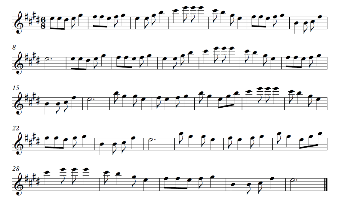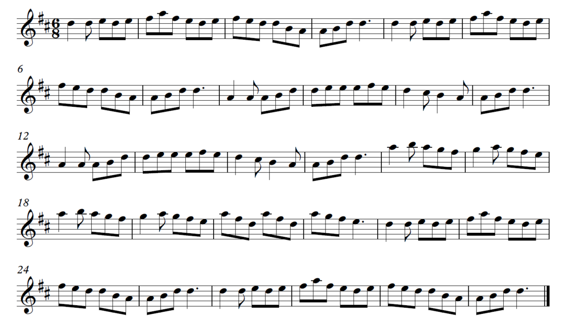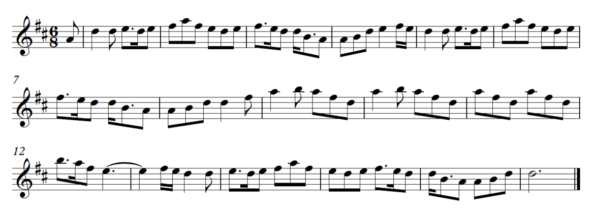 The second arrangement is Tagore's Purano Sei Diner Kotha which is inspired by the traditional Scottish song Auld Lang Syne, with lyrics by Burns. Auld Lang Syne is a popular melody both within Scotland and globally as it is sung most commonly during New Year as a way of bidding the previous year farewell. Burns' text is a reminscence of times past and the title Auld Lang Syne translates to "days gone by" and Tagore's poetry also expresses a similar theme with Purano Sei Diner Kotha translating as "talk of the olden days"13. Similar to the first arrangement, The original versions of each song exist as text and melody. This time, however, the harmonisation of Auld Lang Syne is more homogenous between different recordings14 and the same is true for the recordings I listened to of Purano Sei Diner Kotha15. Melodically, the two songs have different meters. Auld Lang Syne is an almost pesante simple quadruple meter (4/4) while Tagore's version gives the melody a different affect by being in compound duple meter (6/8) that gives the melody a more swaying and lively energy (figure 5 and 6). Furthermore, the melodic inflections of Purano Sei Diner Kotha are slightly different with the melody making more intervalic leaps and small ornamented passages.