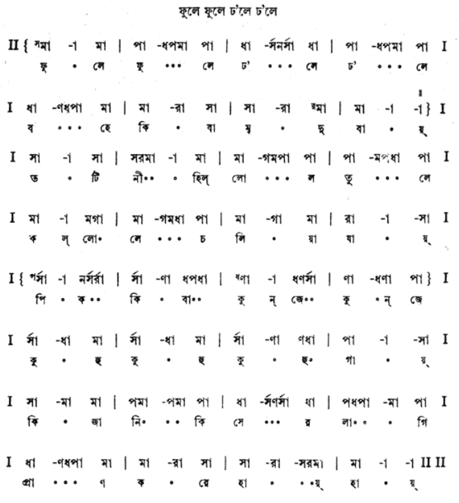 Different scores of Ye Banks and Braes were available for piano and voice (as well as scores for chamber settings and choirs)8 and, as mentioned, each edition had slightly different harmonic progressions. When arranging the original Scottish melody I felt I could explore different appregiations and subtle harmonic substitutions since the different versions that I had listened to had their own harmonic inflections. In terms of melody, I tried to stay faithful to one version (Grainger's arrangement for concert band9) which was the basis of this first half of the arrangement. For Phule Phule Dole Dole, I refered to the original score of the song, written by Tagore, as well as a number of different recordings of the song by famous Bengali singers: Kanika Banerjee, Nilanjana Sarkar and Swagatalakshmi Dasgupta10. Tagore notated the score using traditional system of notation synonomous with Indian classical music known as swaralipi (figure 3). This form of notation uses svara which may be described as an equivalent to solfège in Indian classical music11. Tagore only includes the svara for the melody and his accompanying lyrics in this notation and there is no notation regarding any harmonic structures. This could suggest a degree of artistic license in terms of harmonisation, however, upon listening to recordings of this song by different Bengali singers, I was quite surprised at how harmonically similar the progessions were in each of the versions. Rabindra sangeet, like other forms of Indian classical music, is an aural tradition12. This could explain why the different versions of the song have the same harmonic progression despite Tagore not notating this in the swaralipi.