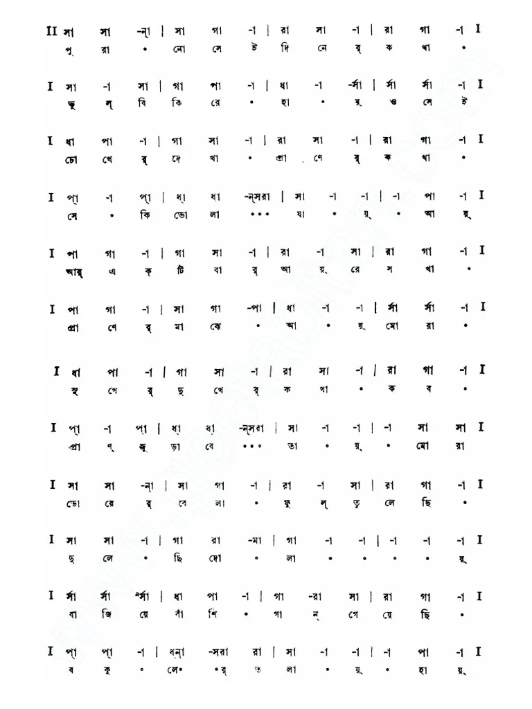 Auld Lang Syne is sung at the end of ceremonies as a sort of cathartic appreciation during mass gatherings16 and so the song is often performed by a large group of people in an almost choral manner. I was, therefore, interested in looking at arrangements of the song for SATB chorus so that I could arrange the original Scottish song in this way17. For Tagore's score, I refered to the original swaralipi (figure 7) and the various recordings of the song for the harmonic basis (Dasgupta, Biswas and Kumar).