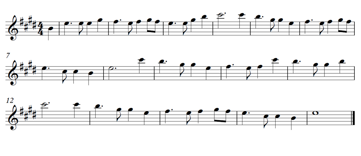 I decided to follow the model of Dyens' arrangement by including a brief introduction (bars 1 -6) featuring a short motific quote of part of the melody of both songs. This motif is quoted using a rhythm that is characteristic of Scottish traditional - the "Scotch snap". The Scotch snap (also known as the Lombard rhythm) is a dotted, syncopated rhythm consisting of two notes with the second note being the longer of the two (figure 3). This rhythm is a recognisable feature of the original Scottish melody of Ye Banks and Braes. The arrangement then includes the complete melody of Ye Banks and Braes with harmonisation and subtle counterpoint (bars 7 - 23) which is then repeated with the melody being explored in different registers, moving between the bass and soprano voices (bars 24 - 40). A short episodic progression (bars 41 - 44) brings the piece to its second part with the arrangement of Phule Phule Dole Dole. Again, the full melody of the original song is presented but this time in a more homophonic manner (bars 45 - 74) with a harmonic progression that is similar to the recordings (Banerjee, Sarkar and Dasgupta) I listened to. The arrangement concludes with a two bar quotation of part of Ye Banks and Braes including the Scotch snap as a sort of homage to the introduction.