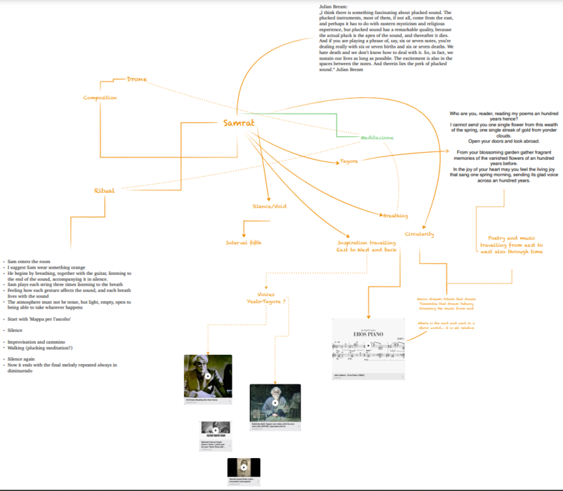 From the top of this mindmap, the first influence is a quotation by classical guitarist, Julian Bream, which describes how the majority of plucked string instruments come from Eastern cultures (for more on this see Introduction) and the philosophy of plucked sound being a series of "births and deaths" due to the sound of a plucked string not having sustain5. Towards the bottom right hand side of the map, we see the influence of Tagore's poetry, with Dr. Ramelli including the poem The Gardener 85. In this poem, Tagore discusses the timelessness of art whereby any artwork can be experienced at different times and trascend the timespan of a human lifetime. This idea of artistic 'time travel' and the travel between East and West is an important influence within this composition. Dr. Ramelli, then visits an idea that provided a new persepective to this idea of Eastern cultures; the East being a relative term. Depending on one's location on the globe, the East will represent different cultures based on geographical orientation. For example: for Dr. Ramelli, East would be the culture of Takemitsu. For Takemitsu, East would be the culture of John Adams. For Adams, East would be the culture of Claude Debussy. For Debussy, East would would be the culture of Ramelli. Of course, this is a technicality and within a "Western" context, the East has come to represent regions and cultures in Asia, East of Europe (this is largerly in part due to the rise of the term "Orientalism" in Western literature)6. However, this is an eye-opening idea that shows the circularity of the concept of the East. Inspiration goes round and comes round and perhaps Eastern cultural inspiration may be percieved as something that encircles itself. In relation to this thought, Dr. Ramelli includes a recording of John Adams' Eros Piano (1989), a piece inspired by Takemitsu, another example of a work (this time for orchestra and piano) with an Eastern cultural influence7. The next influence is the similarity that Dr. Ramelli noticed between the oration of the poets Tagore and W.B. Yeats. Both seem to speak with a spaciousness and resonance when reciting their works or essays and this fascinated Dr. Ramelli. The idea that two poets from different cultural hemispheres could speak with a similar sense of presence was something that Dr. Ramelli looked to represent within the work. Both speak with a gravitas and authority that is perhaps indicative of their immense wisdom. Here are the videos Dr. Ramelli included in his mindmap, notice the similarity in recitation of the two men: the spacing between words and the pacing of their phrasing.