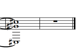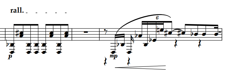 With this series of directions, Dr. Ramelli is incorporating the concept of meditation in the performance of the work. Meditation is an important part of religious practices in India, especially Hinduism and Buddhism8. A key skill within meditation is the awareness of breath - a concept discussed extensively in the hindu scripture, The Bhagavad Gita9 - and this is explored further in within the piece itself. Before I perform the commisioned piece, the ritual indicates that I preface the work by performing the short piece, Mappa per l'ascolto ("Map for Listenting"), also by Dr. Ramelli. This piece is based on a poem of the same name by Chandra Candiani. The poem expresses the spirtuality connected with the act of true meditative listening and this short piece works at representing this theme through the same kind of breath and silence that is part of the meditation of this ritual (see figure 3 for the full score to this piece). Upon playing this work, there shall be a moment of silence before performing the commisioned work Improvvisazione, cammino e canto. Translated from Italian, the title of the piece is "Improvisation, camino and song". Throughout the work, Dr. Ramelli uses certain musical devices to express the concept of meditation and breath. Two of these musical devices are: silence and the use of pedal notes (drones). At certain points in the piece, there a full bars of rest which, like Takemitsu's representation of Ma (Chapter I, Part I), encourage a feeling space, awareness and breath in the same way one would approach meditation (figures 4 and 5). The use of pedal notes creates the idea of meditation on a single note and the resonance of these deep bass tones creates a uniformity in sound that encorages the performer to be aware of the the sound they produce on one single string and one single note (the bass drone is present throught the whole of the camino section of the piece - bar 25 - 112, see figure 6 for the full score).