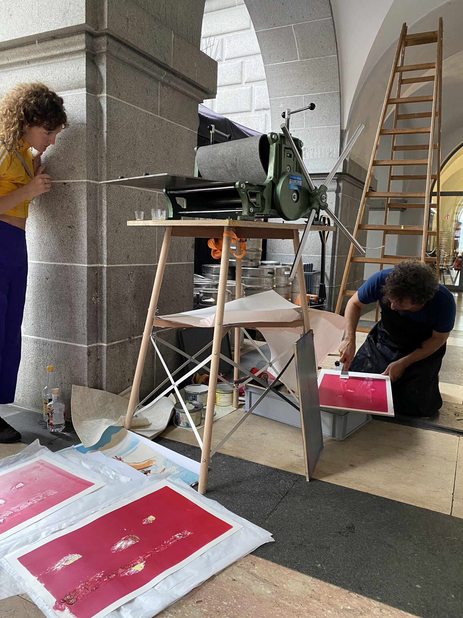 A mobile gravure press "Tracey" is located in the inner courtyard of the university. We have freed it from any reproduction tasks. We question it together, side by side, in the here and now with the things that are at hand. We play their stage with the material printing process and print in the discursive interplay between craft and concept, between laboratory and oracle. The two-day experimental workshop will take place on June 15 and 16, 2023. The workshop will be led by Florian Dombois and Michael Güntzburger.