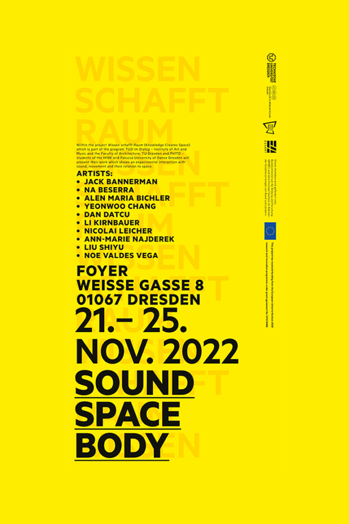 Within the project Wissen schafft Raum (Knowledge Creates Space) which is part of the program TUD im Dialog – Institute of Art and Music and the Faculty of Architecture, TU Dresden and PhfTD – students of the HfBK and Palucca University of Dance Dresden will present their work which shows an experimental interaction with sound, movement and their relation to space.