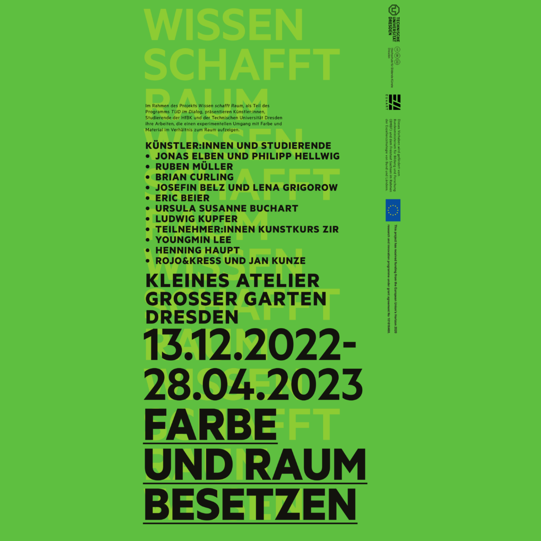 In the northern city park “Großer Garten (Great Garden), the small studio stands like a foreign body in the landscape. This place is the starting point for the experimental investigations of color and material in relation to space. In the coming weeks, students of the HfBK Dresden, the TU Dresden and artists will present their installations here throughout the entire event period. The installations will also be open to the public after the openings. The event will be held in German.