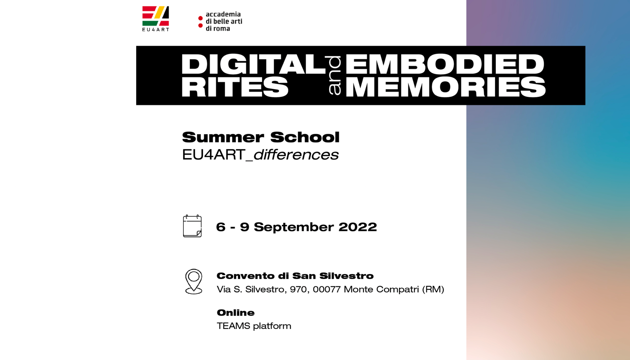 Within a bucolic and spiritual landscape that characterises the Roman countryside, ABARoma organised four full days of webinars and workshops in order to tackle two main research questions: Do we need digital rites, and how can we shape them? Are our digital experiences translating into embodied memories?