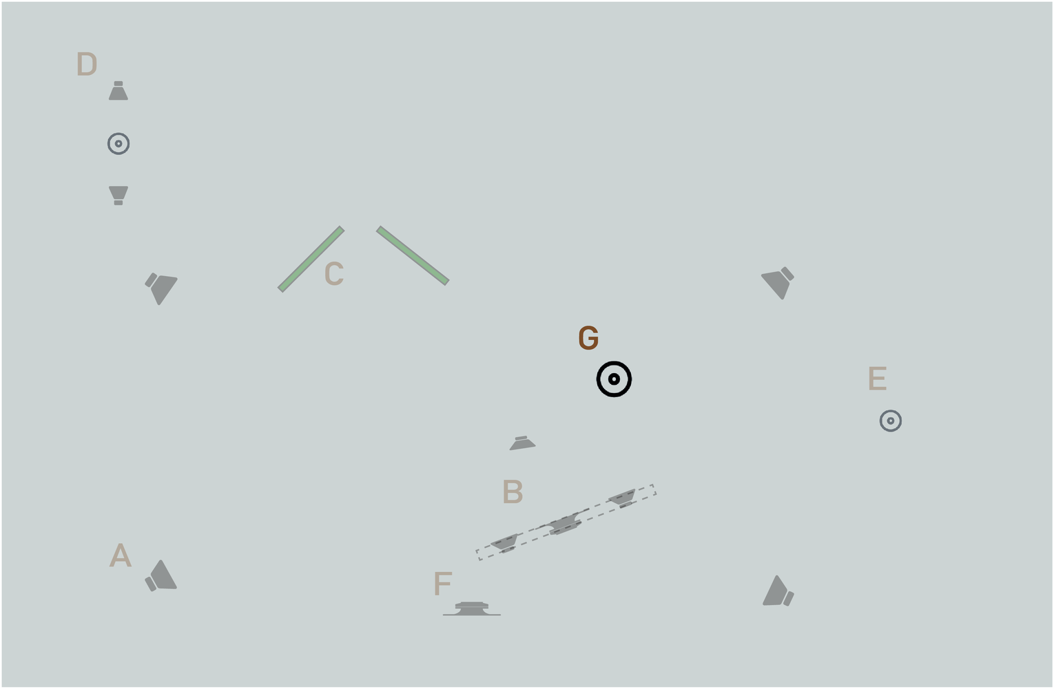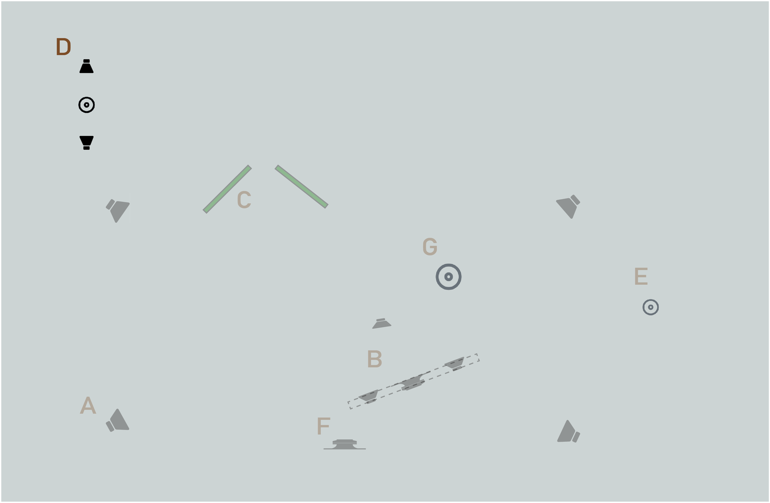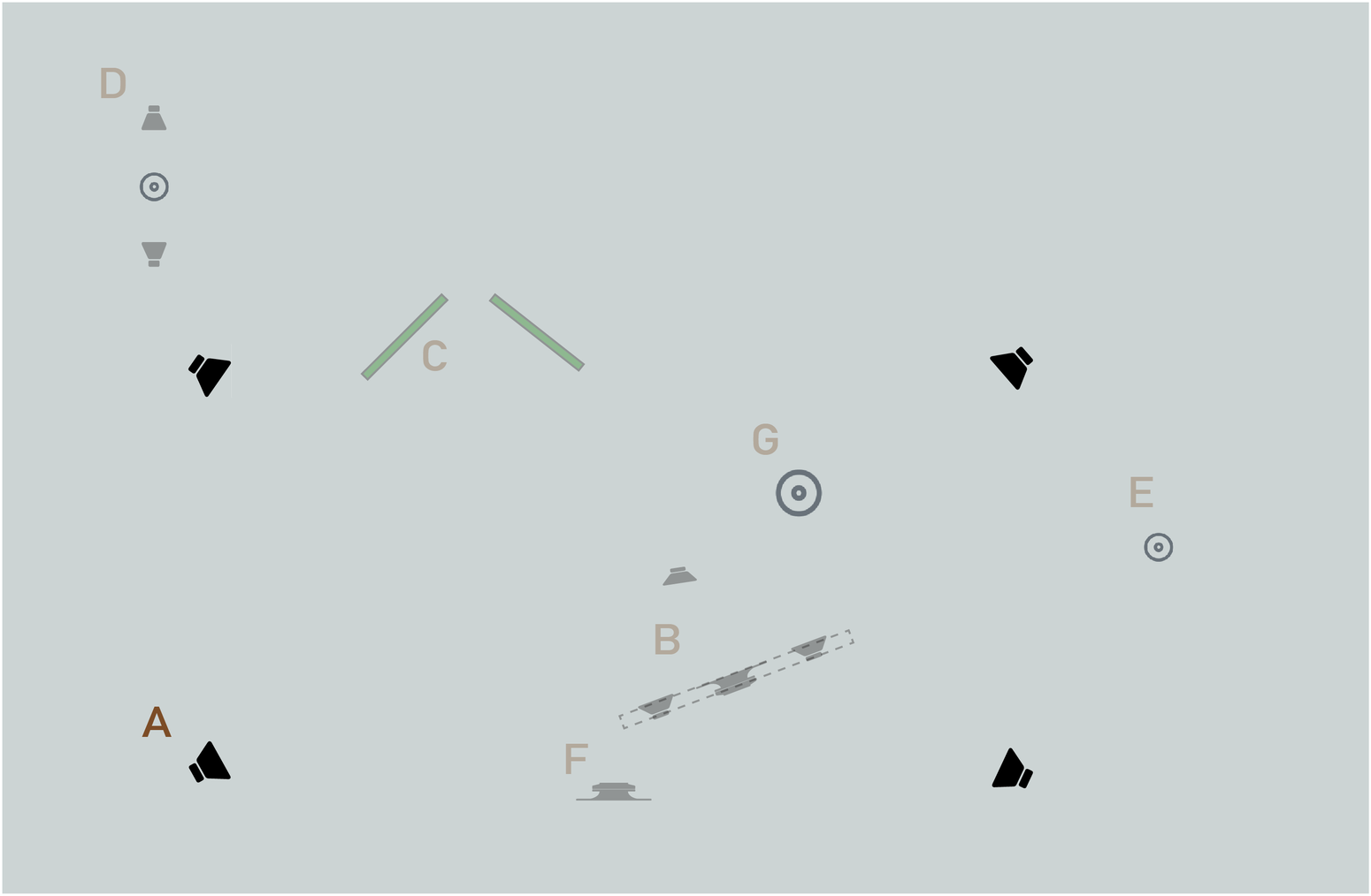 On the left column below the floor plan of Focus is presented. In each row a different version of this diagram highlights a different loudspeaker constellation. On the right column a small video (automatically activated) portrays visually this specific constellation in the space of the installation.