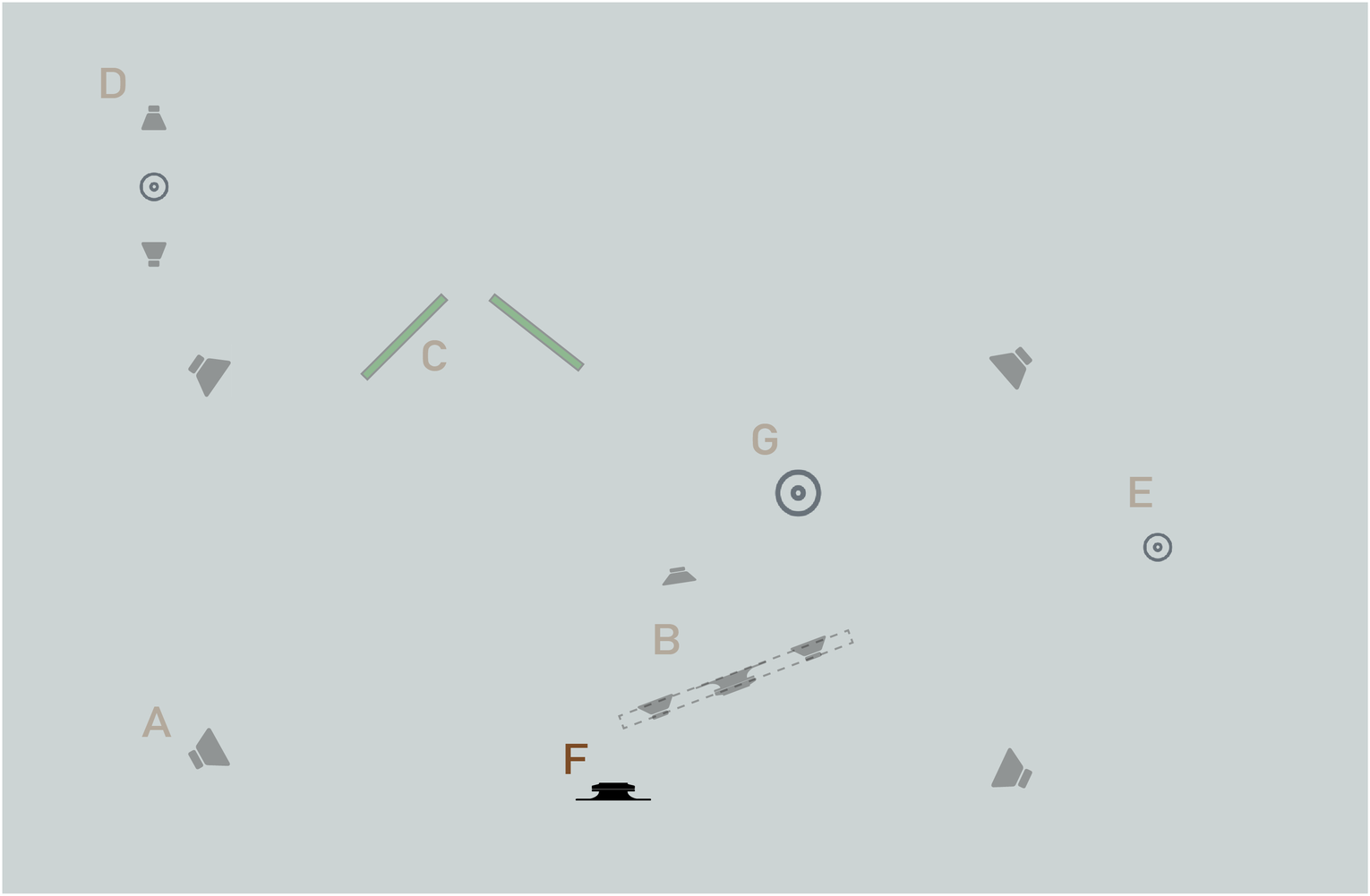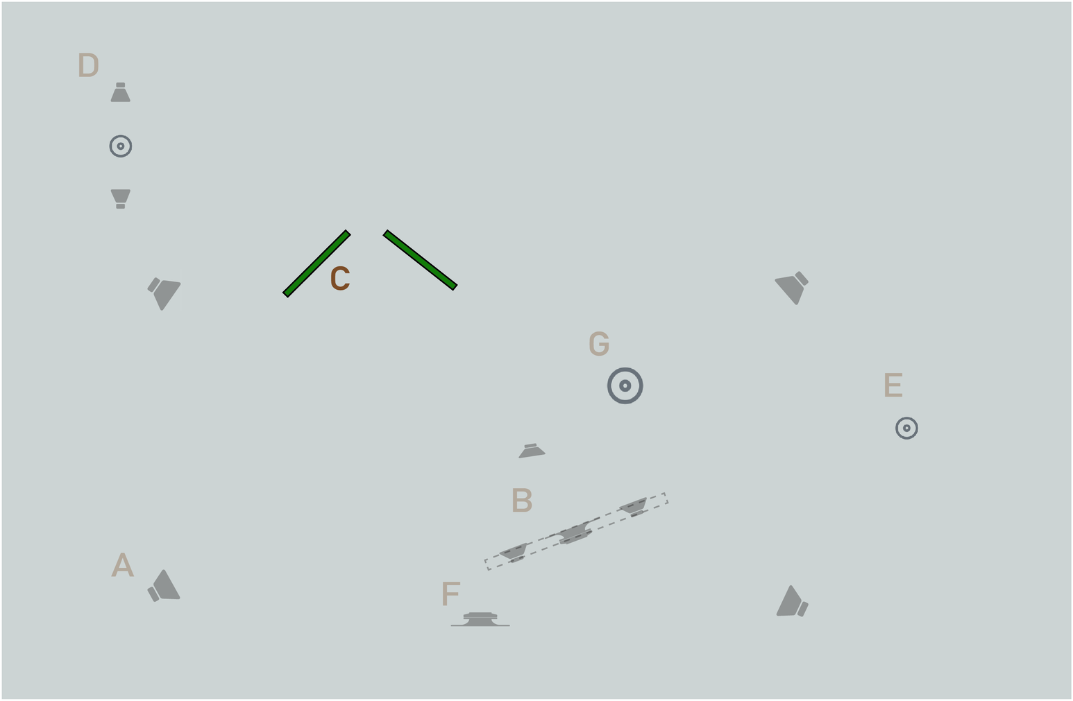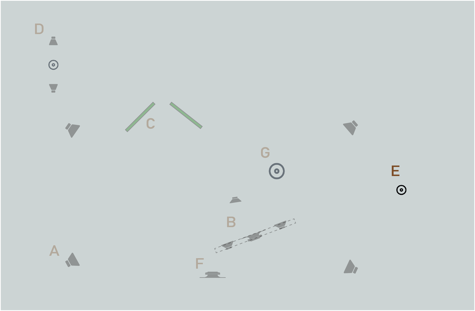 On the left column below the floor plan of Focus is presented. In each row a different version of this diagram highlights a different loudspeaker constellation. On the right column a small video (automatically activated) portrays visually this specific constellation in the space of the installation.