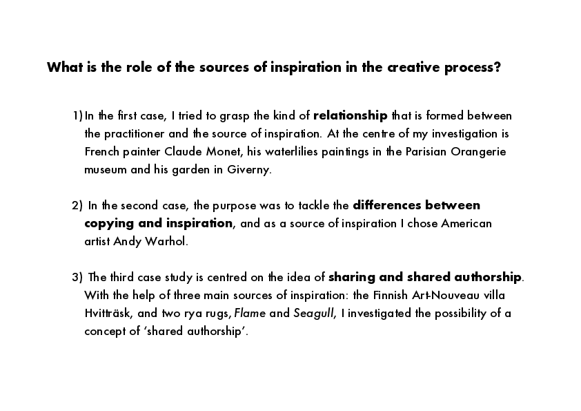 The main purpose of my dissertation “The Making of Inspiration – From Monet to Warhol and beyond” was to find out what is the role of the sources of inspiration in the creative process.