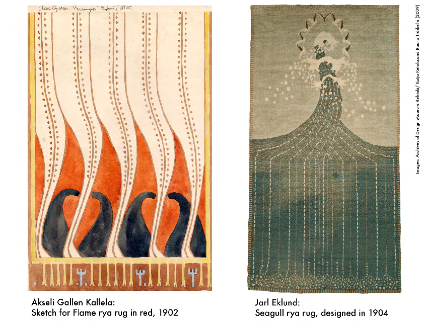 Next to Hvitträsk I selected two other sources, Flame (sketch from 1902) rya rug by Finnish artist Akseli Gallen–Kallela and Seagull rya rug on the right side by Finnish Architect Jarl Eklund. Both rugs have a some kind of connection two Hvitträsk and each other; Gallen-Kallela gave a version of Flame to his friend Eliel Saarinen, and as a young architect Eklund was working in Hvitträsk, and he must have been familier with Flame that time.