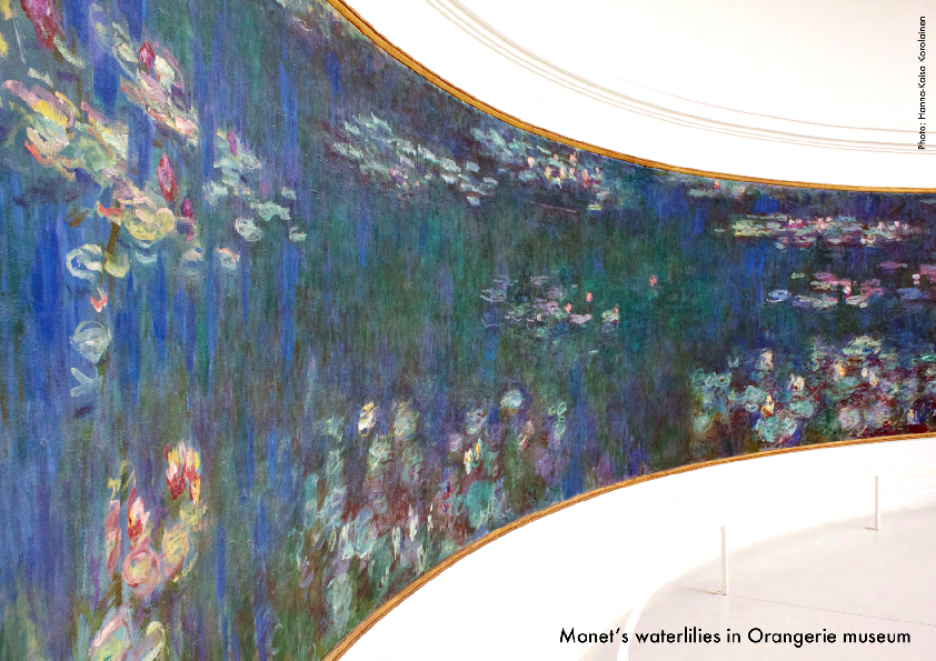 painter Claude Monet, his waterlilies paintings in the Parisian Orangerie museum and his