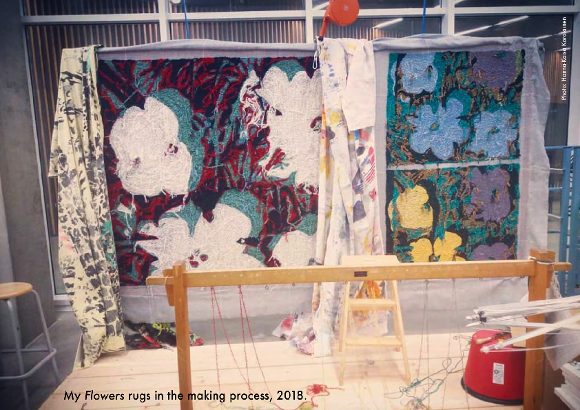 What I really wanted to discover related to the topic of copying, was my own position. How I would I feel during the process? While slowly copying Flowers into my rug and rug cushion pieces I did not gain any significant Heureka-moment, instead I started to bond with my artworks, and strangely they started to feel as if they were mine as well.