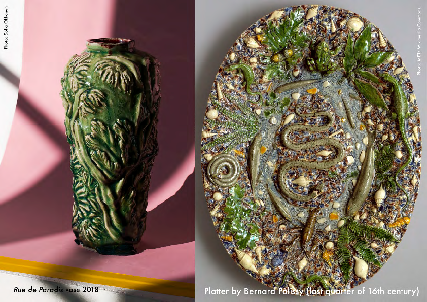 For this Monet case, I decided also to work with ceramics as my textiles were matt, soft and suffocatingly warm, I felt that they needed some kind of contrast. Once I had finished the ceramics pieces equally inspired by Monet’s paintings and flowery garden, I was told that there was a visual similarity to the 16th century French ceramicist Bernard Palissy’s works, as you can see in the image. This platter is from last quarter of the 16th century.